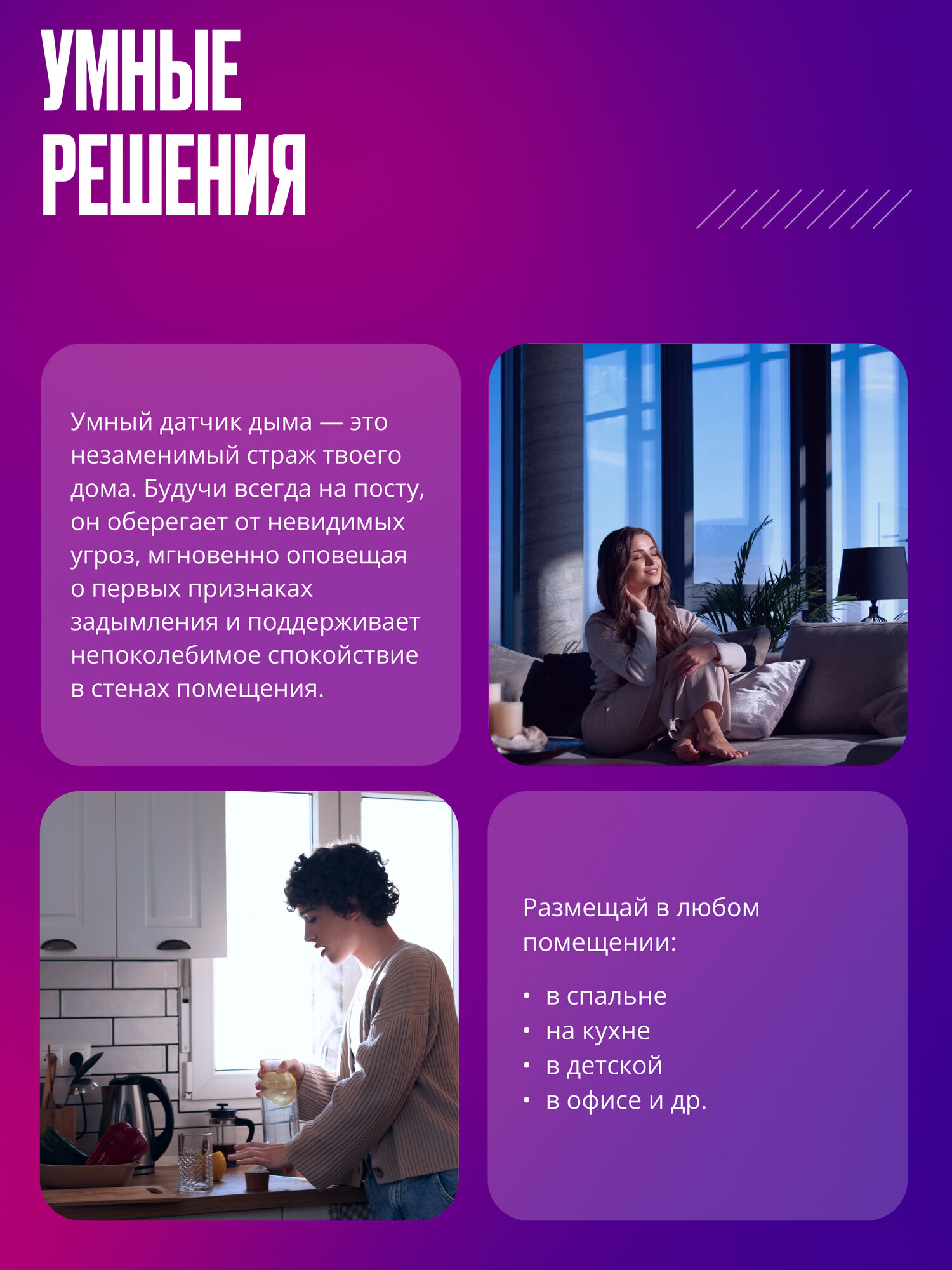 Купить Умный Wi-Fi датчик дыма, автономный пожарный извещатель для умного дома, детектор задымления на батарейках с сиреной с доставкой по всей России.