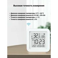 Датчик работает сам по себе, без шлюза. Имеет стильный дизайн и экран, на котором показывается температура, влажность, дни недели, время.