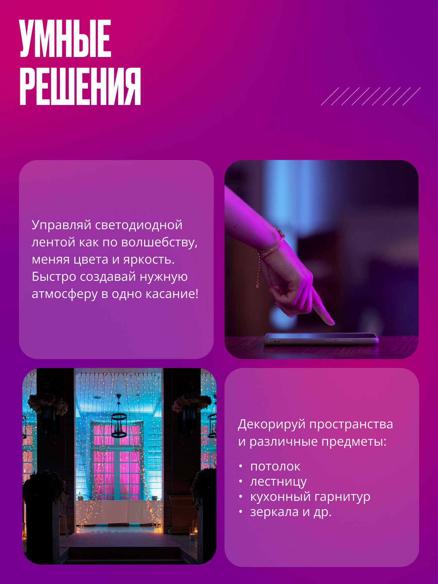 | Подробная комплектация | Умный контроллер с WIFI приёмником, RF пульт, инструкция. |