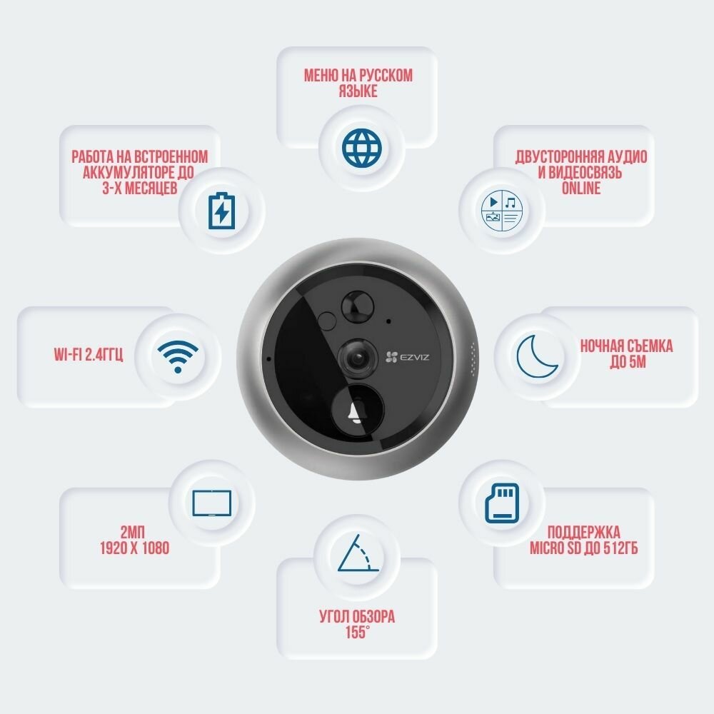 Купить Умный wi-fi видеоглазок, звонок, домофон Ezviz DP2 (3mp) Дверной глазок с камерой и двусторонней связью с доставкой по всей России.