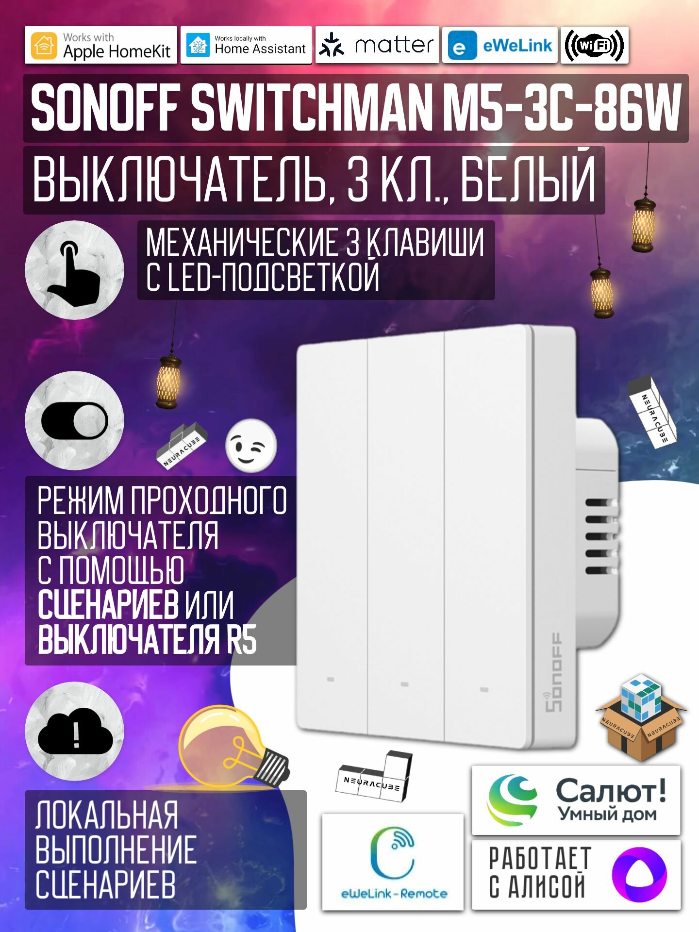 SONOFF M5-3C-86W — это умный настенный выключатель, поддерживающий протокол Matter, что обеспечивает его совместимость с различными экосистемами умного дома, включая Apple Home, Google Home, Amazon Alexa и Яндекс Алиса.