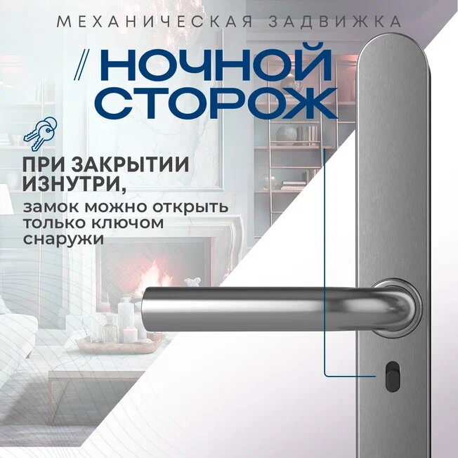 Замок дверной работает от 4 батареек АА, при температуре от -10°С до +55°С (необходимо, чтобы внутренняя ручка (с батарейками) замка находилась в помещении с положительной температурой). В случае разряда батареек замок можно открыть механическим ключом (в комплекте 2 ключа) или подключить