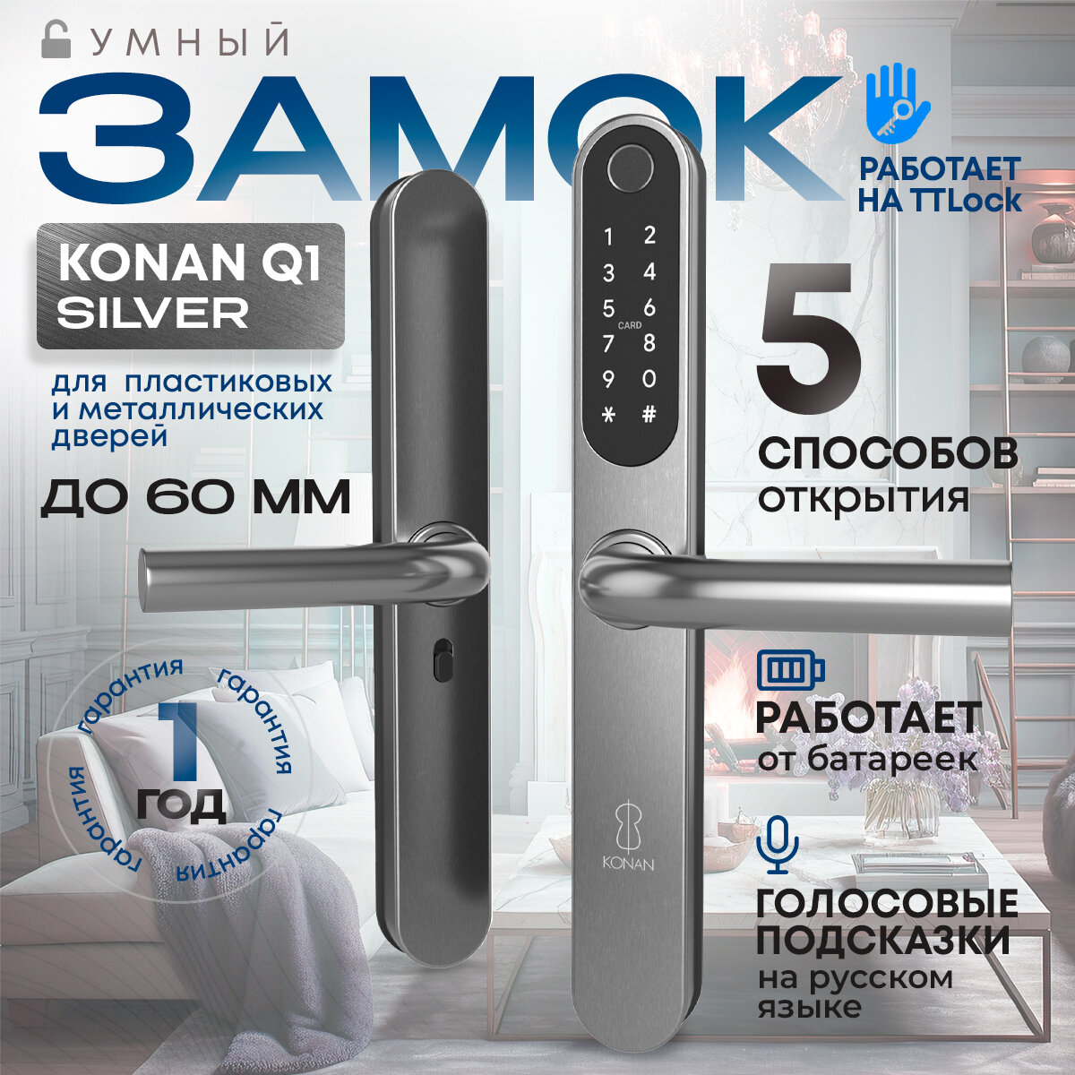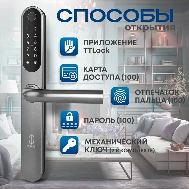 Умный замок Konan Q1 – это точное сочетание надёжности, современных технологий и стиля, которое позволяет Вам контролировать доступ к Вашему дому или офису с помощью различных методов.