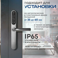 Корпус умного замка имеет защиту от пыли и влаги IP65, внешнюю ручку можно ставить на уличную дверь, но внутренняя ручка должна находиться в помещении с положительной температурой. Замок НЕ подходит для установки на улице (ворота, калитки), т. к необходимо, чтобы внутренняя ручка (с батарейками) замка находилась в помещении с положительной температурой.