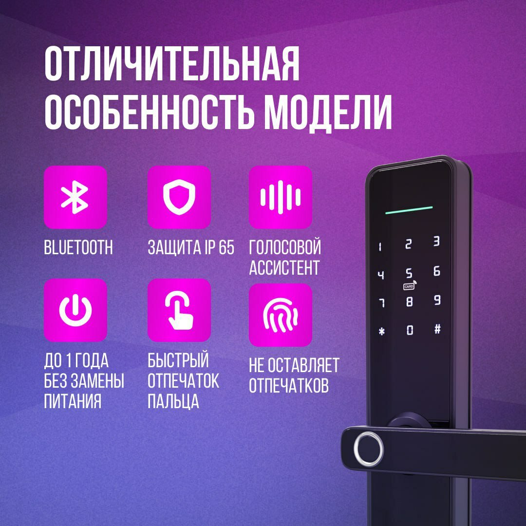 Элегантный дизайн умного замка, прочная износостойкая поверхность прекрасно впишутся в современный интерьер, дополнив Вашу систему умного дома. Размеры умного замка: 300х65х23 мм. Умный биометрический замок подходит для левой и для правой двери, просто переставьте ручку в нужную сторону в процессе установки замка. Умный дверной замок Конан имеет защиту от влаги и пыли IP65, Wi-Fi и Bluetooth последнего поколения.