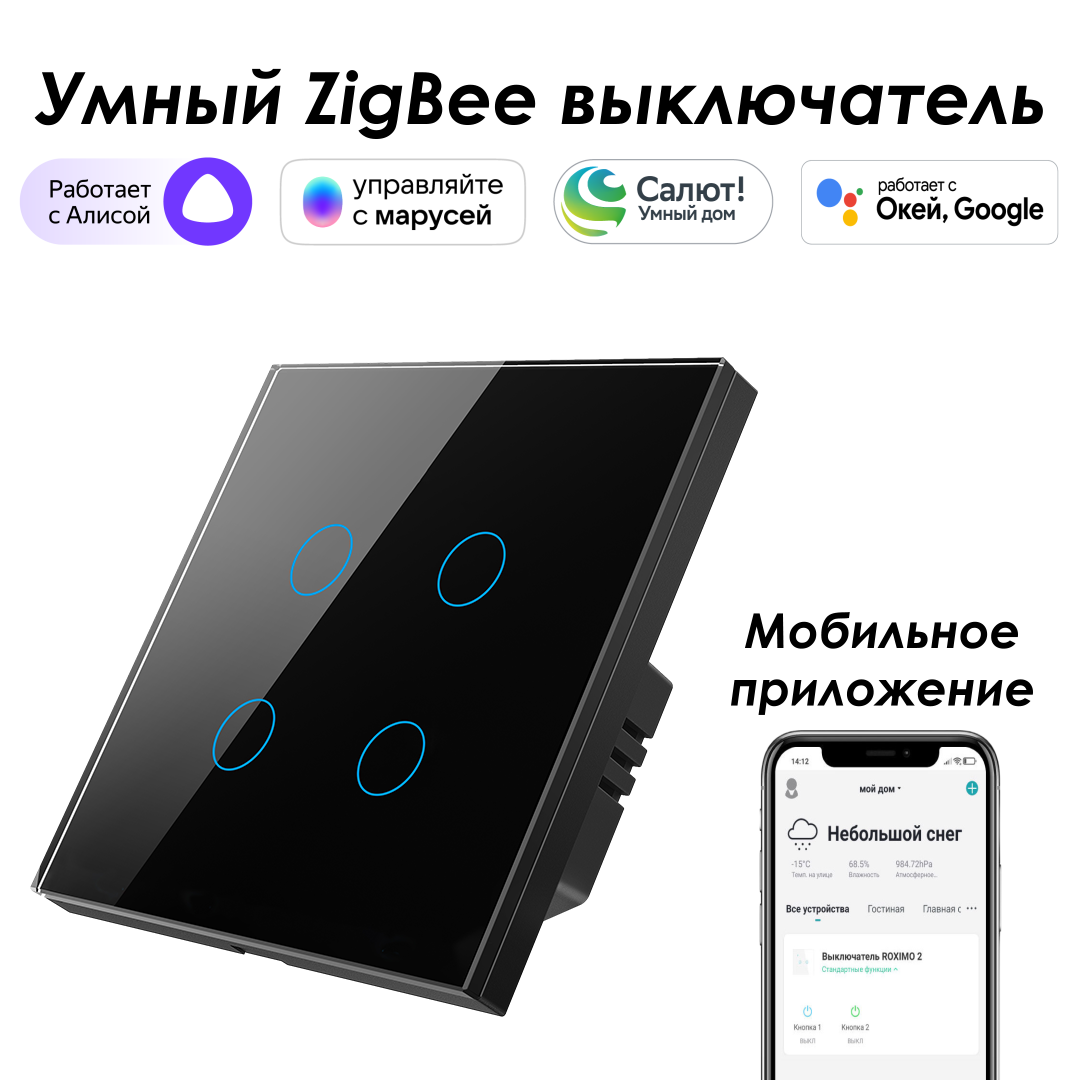 Умный Zigbee выключатель ROXIMO сенсорный, четырехкнопочный, черный: сравнение цен, характеристики, фото, актуальное наличие и цены.