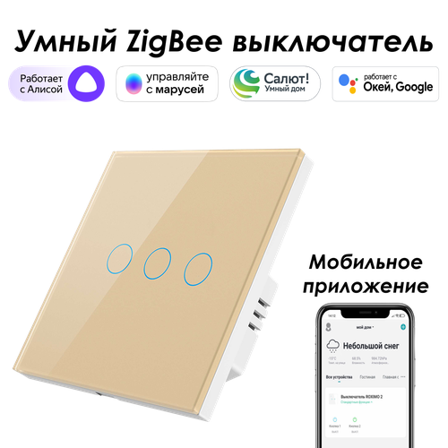Умный Zigbee выключатель ROXIMO сенсорный, трехкнопочный, золотой: сравнение цен, характеристики, фото, актуальное наличие и цены.