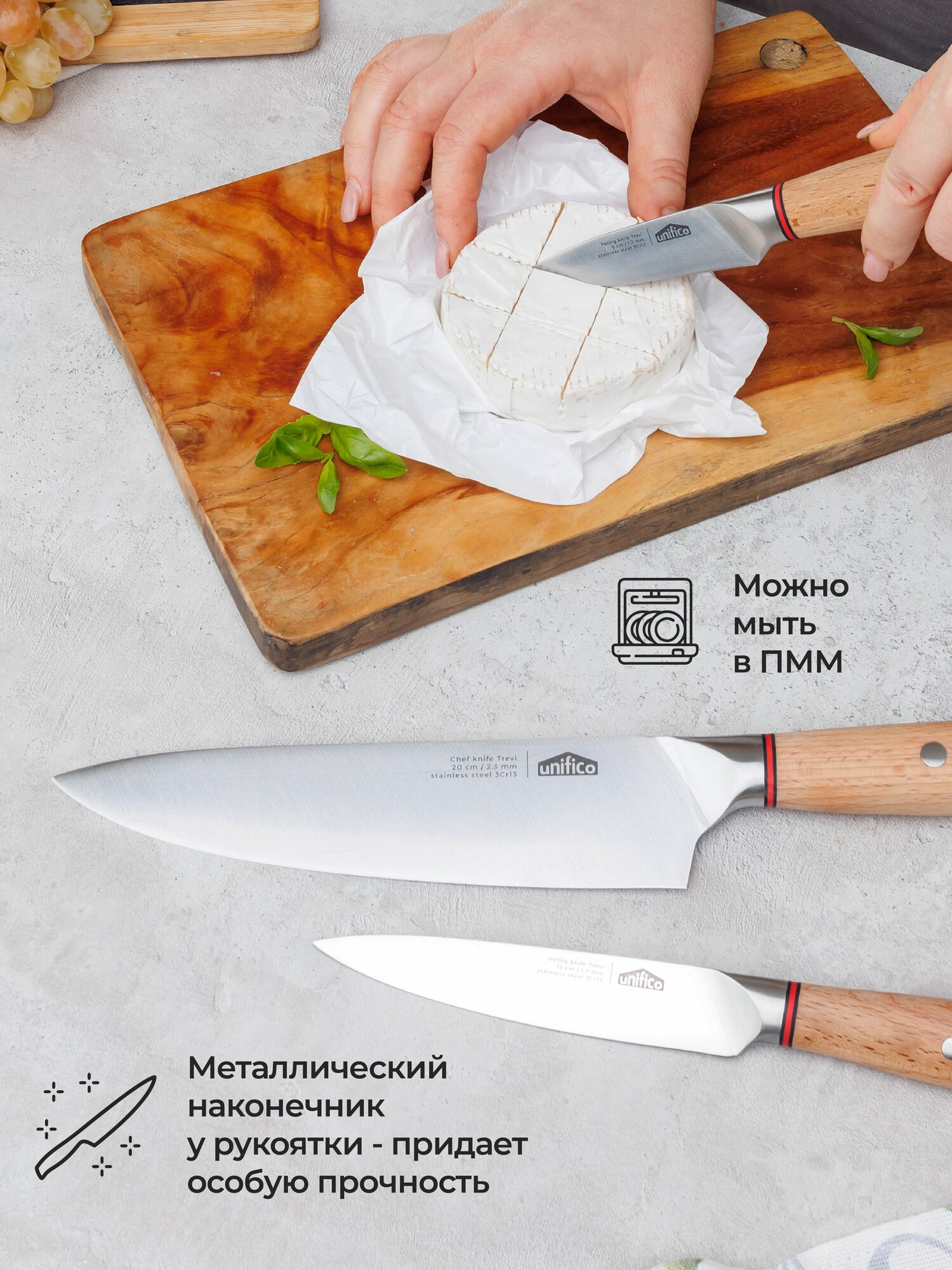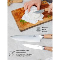 Рукоятка ножей из натурального дерева со специальной защитной обработкой и стильный металлический наконечник придает им красоту и эстетичность.