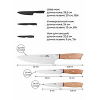 Шеф-нож - длина лезвия 20 см, толщина лезвия 2,2-2,5 мм, вес 195 г, длина ножа с ручкой 33,5 см