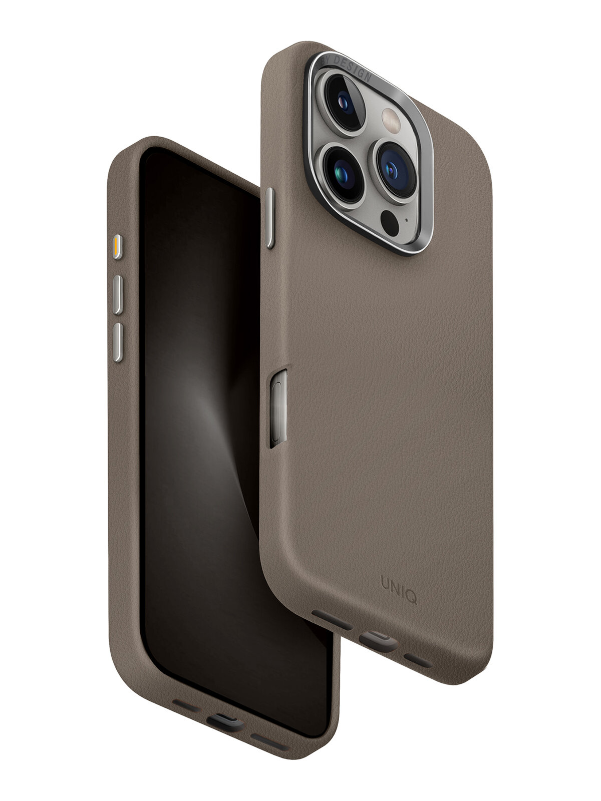 Uniq Lyden - серия чехлов для iPhone из премиальной экокожи. Материал приятный на ощупь и имеет фактуру настоящей кожи. Не скользит в руках или по поверхностям, смягчает при падении и других физических воздействиях, сохраняя телефон в первозданном виде. Накладка сделана из прочного пластика с укрепленными углами. Внутренняя часть проложена мягкой микрофиброй, материал не оставляющий царапин, а так же придающий дополнительную амортизацию. Алюминиевый безель возвышается вокруг блока камеры, не давая линзам касаться поверхностей, на которых лежит телефон. На задней крышке спрятан магнитный держатель MagSafe, позволяющий заряжать гаджет по технологии Qi, либо использовать другие аксессуары, имеющие магнитное кольцо.На боковых гранях расположены дублирующие металлические кнопки.