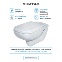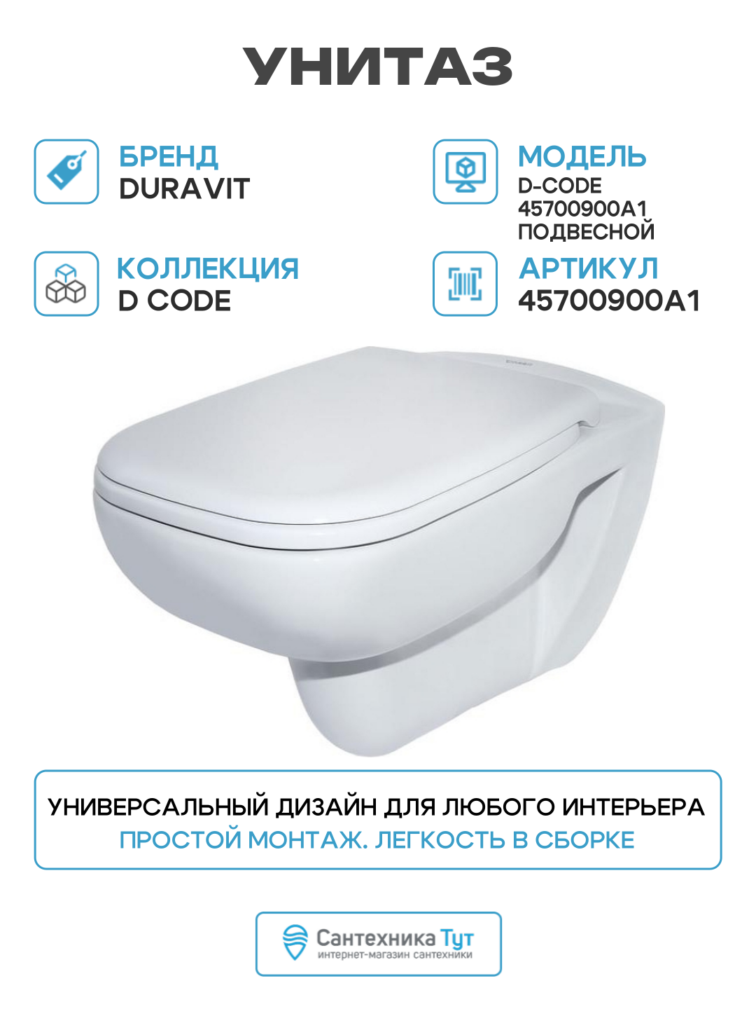 Купить Унитаз Duravit D-Code 45700900A1 подвесной с сиденьем Микролифт белый фаянс подвесной с доставкой по всей России. Унитаз Duravit D-Code 45700900A1 подвесной с сиденьем Микролифт белый фаянс подвесной: сравнение цен, характеристики, фото, актуальное наличие и цены.