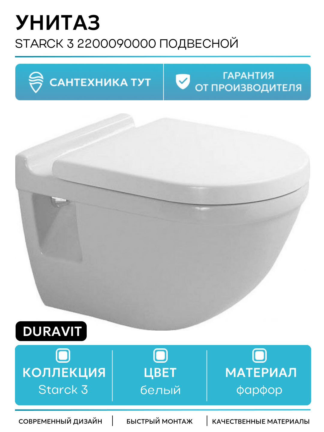 Купить Унитаз подвесной Duravit Starck 3 2200090000, без сиденья, цвет белый. с доставкой по всей России. Унитаз подвесной Duravit Starck 3 2200090000, без сиденья, цвет белый.: сравнение цен, характеристики, фото, актуальное наличие и цены.