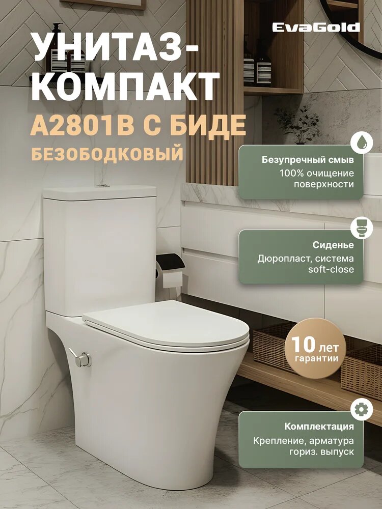 Купить Унитаз-компакт напольный EvaGold A2801B с микролифтом, безободковый, фаянсовый, антивсплеск, белый, с нижним подводом, с биде, овальный с доставкой по всей России. Унитаз-компакт напольный EvaGold A2801B с микролифтом, безободковый, фаянсовый, антивсплеск, белый, с нижним подводом, с биде, овальный: сравнение цен, характеристики, фото, актуальное наличие и цены.