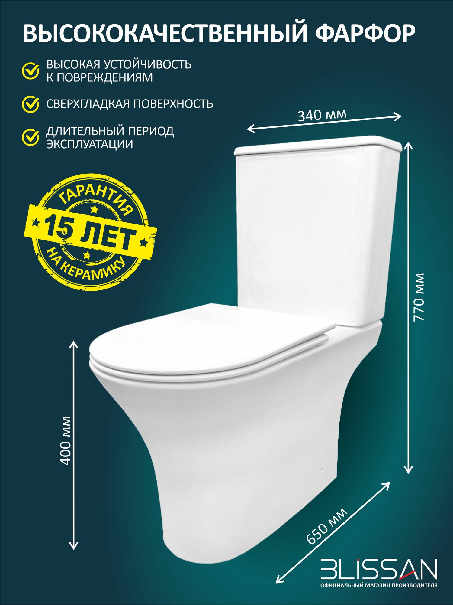 - Современный дизайн: унитаз напольный компакт BLISSAN Style Rimless станет стильным акцентом в интерьере вашей ванной комнаты.
