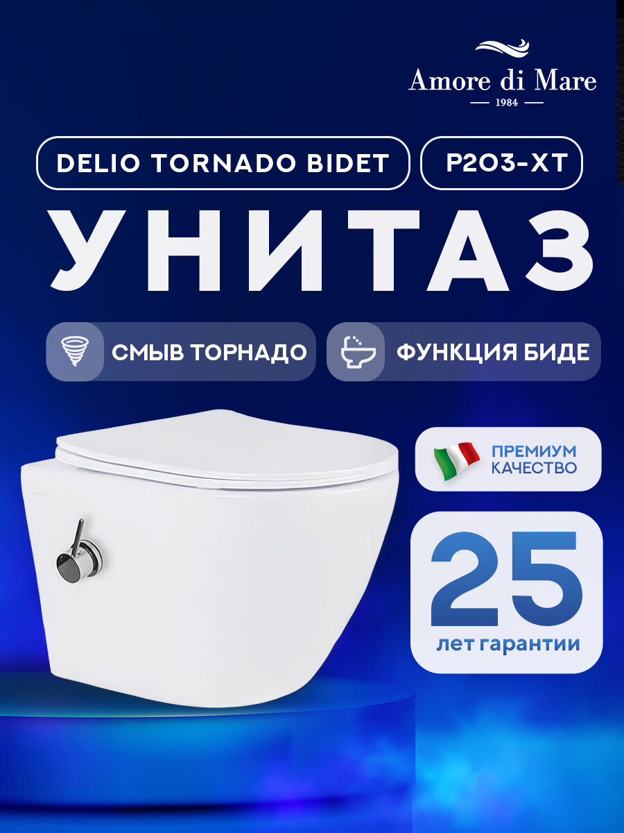 Купить Унитаз подвесной безободковый Amore di Mare Delio Tornado Bidet P203-XT с функцией биде, смыв Торнадо, сиденье микролифт с доставкой по всей России.