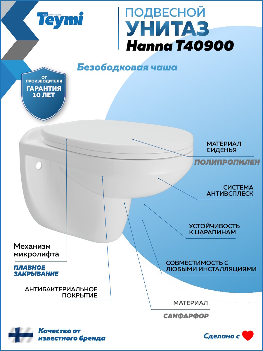 Унитаз подвесной безободковый с сиденьем микролифт Teymi Hanna T40900: сравнение цен, характеристики, фото, актуальное наличие и цены.