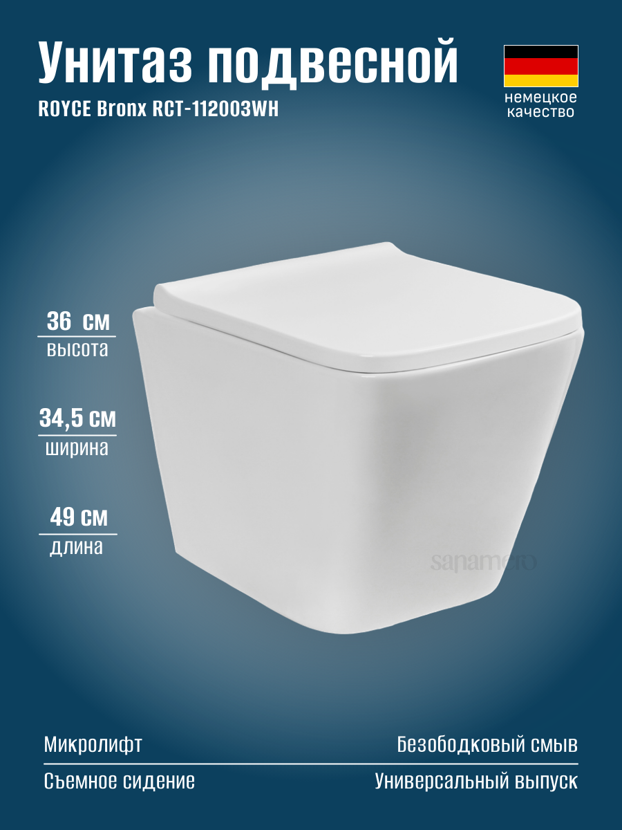 Унитаз подвесной ROYCE Bronx RCT-112003WH, безободковый, сиденье дюропласт, микролифт, белый: сравнение цен, характеристики, фото, актуальное наличие и цены.