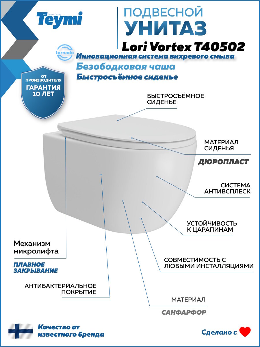 Унитаз подвесной торнадо безободковый с быстросъемным сиденьем микролифт Teymi Lori Vortex T40502: сравнение цен, характеристики, фото, актуальное наличие и цены.