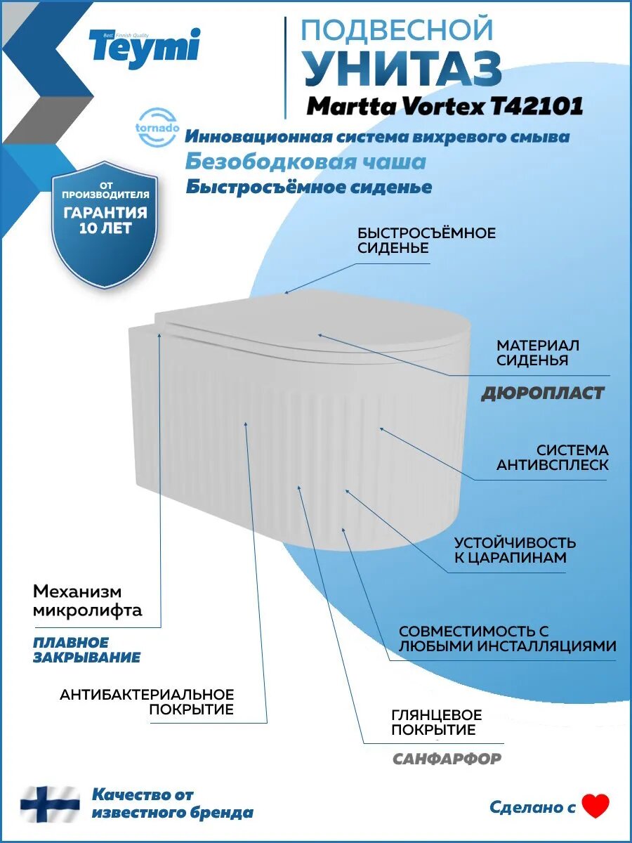 Унитаз подвесной торнадо безободковый с быстросъемным сиденьем микролифт Teymi Martta Vortex T42101: сравнение цен, характеристики, фото, актуальное наличие и цены.