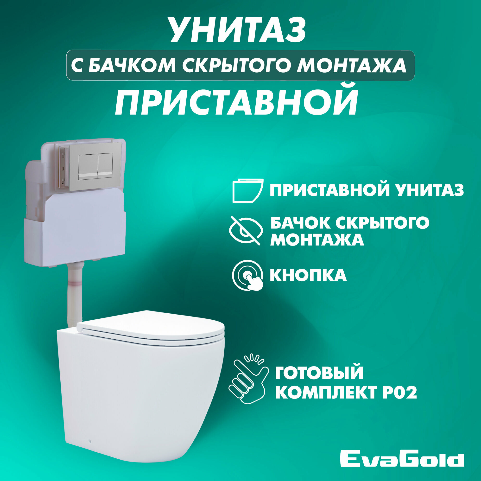Купить Унитаз приставной с бачком скрытого монтажа EvaGold набор ND802.3 безободковый, с кнопкой смыва квадрат хром матовый с доставкой по всей России.
