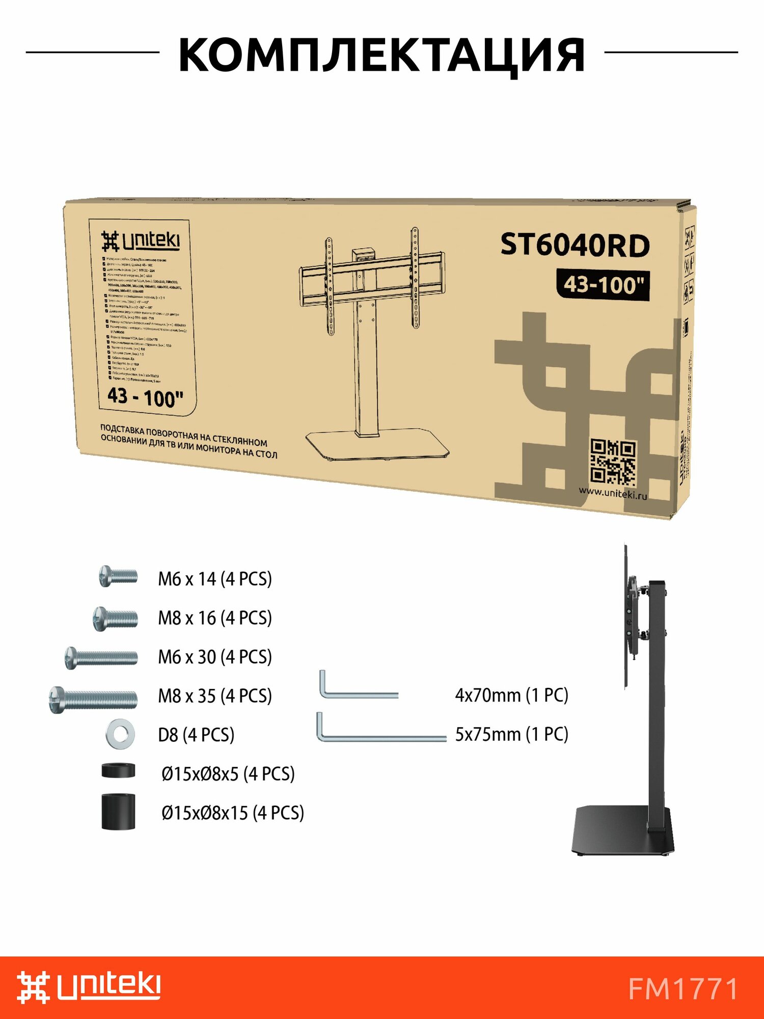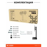 Вашему вниманию представляется новинка UNITEKI ST6040RD, которая предназначена для большинства средних и больших Жк, LED, OLED, QLED телевизоров и мониторов диагональю от 43 до 100 дюймов (109,22 ~ 254 см.), под самые распространенные крепления стандарта VESA 200x200~600x400 мм.