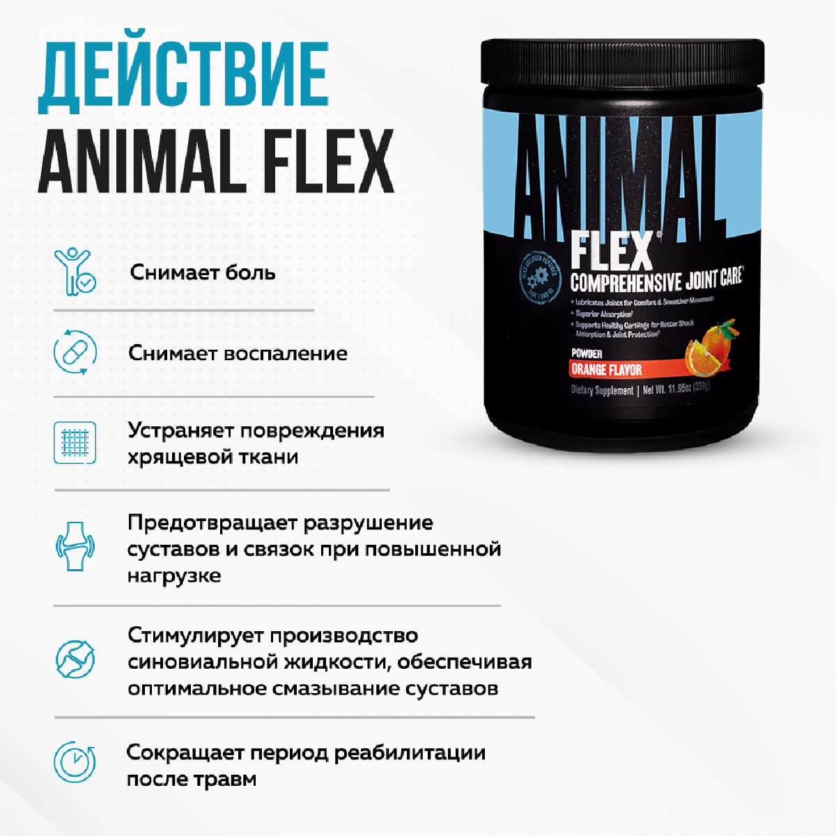 для того чтобы защитить ваши суставы от ежедневного износа, связанного с поднятием тяжестей на тренировках, достаточно принимать 1 мерную ложку в день на пустой желудок или вместе с едой. Animal Flex разработан в качестве важной добавки к рациону спортсменов и содержит необходимые питательные вещества, в которых ваше тело нуждается ежедневно для защиты суставов и связок. Препарат можно принимать без перерывов в течение года. Его можно сочетать с другими добавками Animal. Состав на порцию 11.3 г: Энергетическая ценность - 16 кКал, Белки - 4 г, Витамин С (в форме аскорбиновой кислоты) - 100 мг, Витамин E (в форме D-альфа-токоферола сукцината) - 64 мг, Цинк (в форме оксида цинка) - 15 мг, Марганец (в форме сульфата марганца) - 1 мг. Строительный комплекс - 3000 мг (глюкозамин (в форме гидрохлорида, сульфата 2KCI), метилсульфонилметан (МСМ), хондроитина сульфат A (CSA), хондроитина сульфат C (CSC)). Смазочный и поддерживающий комплекс - 6000 мг (гидролизат коллагена, корень имбиря (гингеролы, шогаолы), корень куркумы (куркумин), экстракт босвеллии пильчатой (камедь) (боллесвиевая кислота), кверцетин, бромелаин, смесь на основе цетил-миристолеата (цетилмиристолеат, цетилмиристат, цетилпальмитат, цетиллаурат, цетилпальмитат, цетилолеат), гиалуроновая кислота). Другие ингредиенты: натуральный и искусственный ароматизатор, лимонная кислота, яблочная кислота, диоксид кремния, сукралоза, ацесульфам калия, красители |