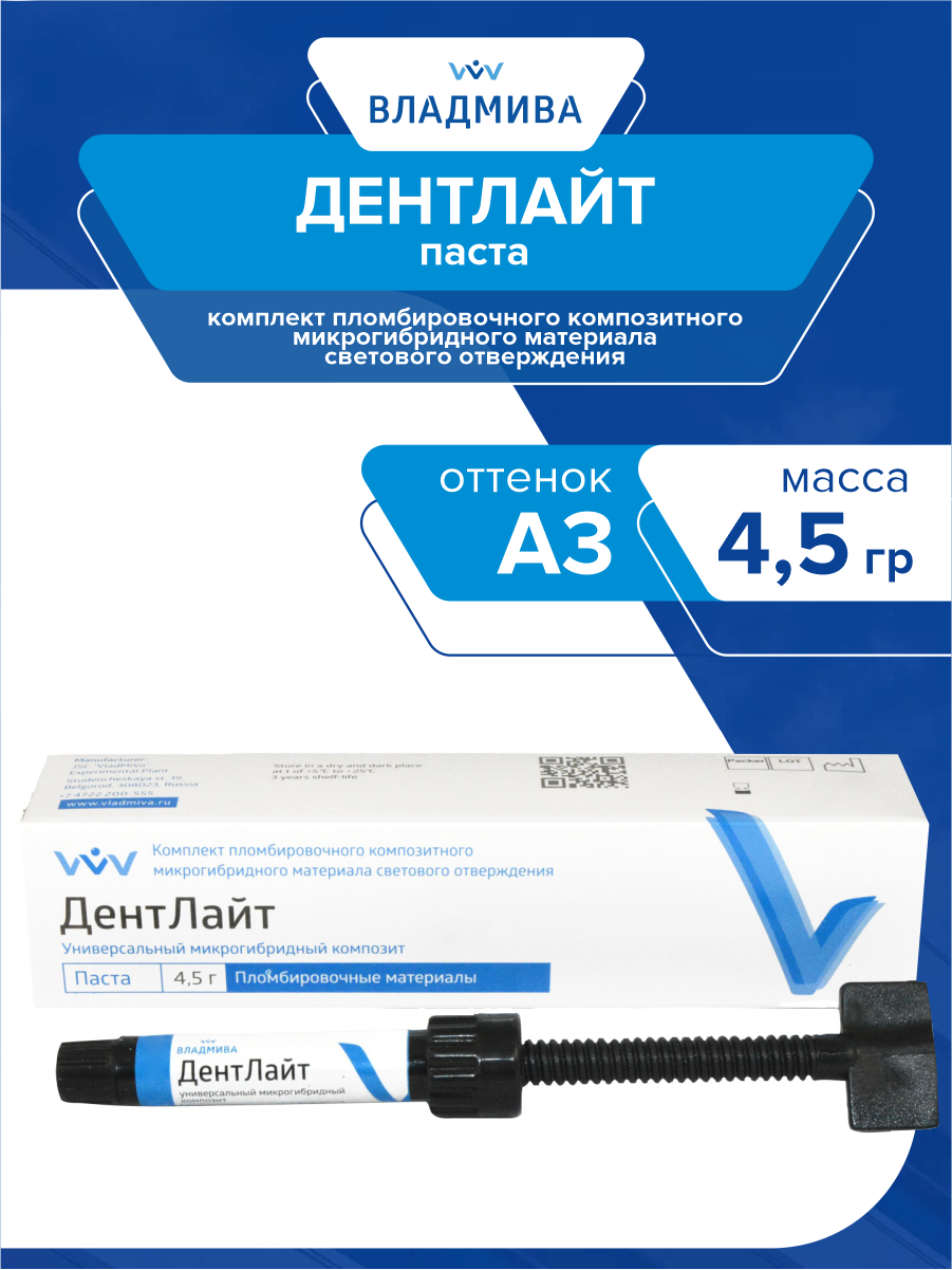 Универсальная композитная паста-шприц ДентЛайт оттенок А3 4,5 гр.: сравнение цен, характеристики, фото, актуальное наличие и цены.