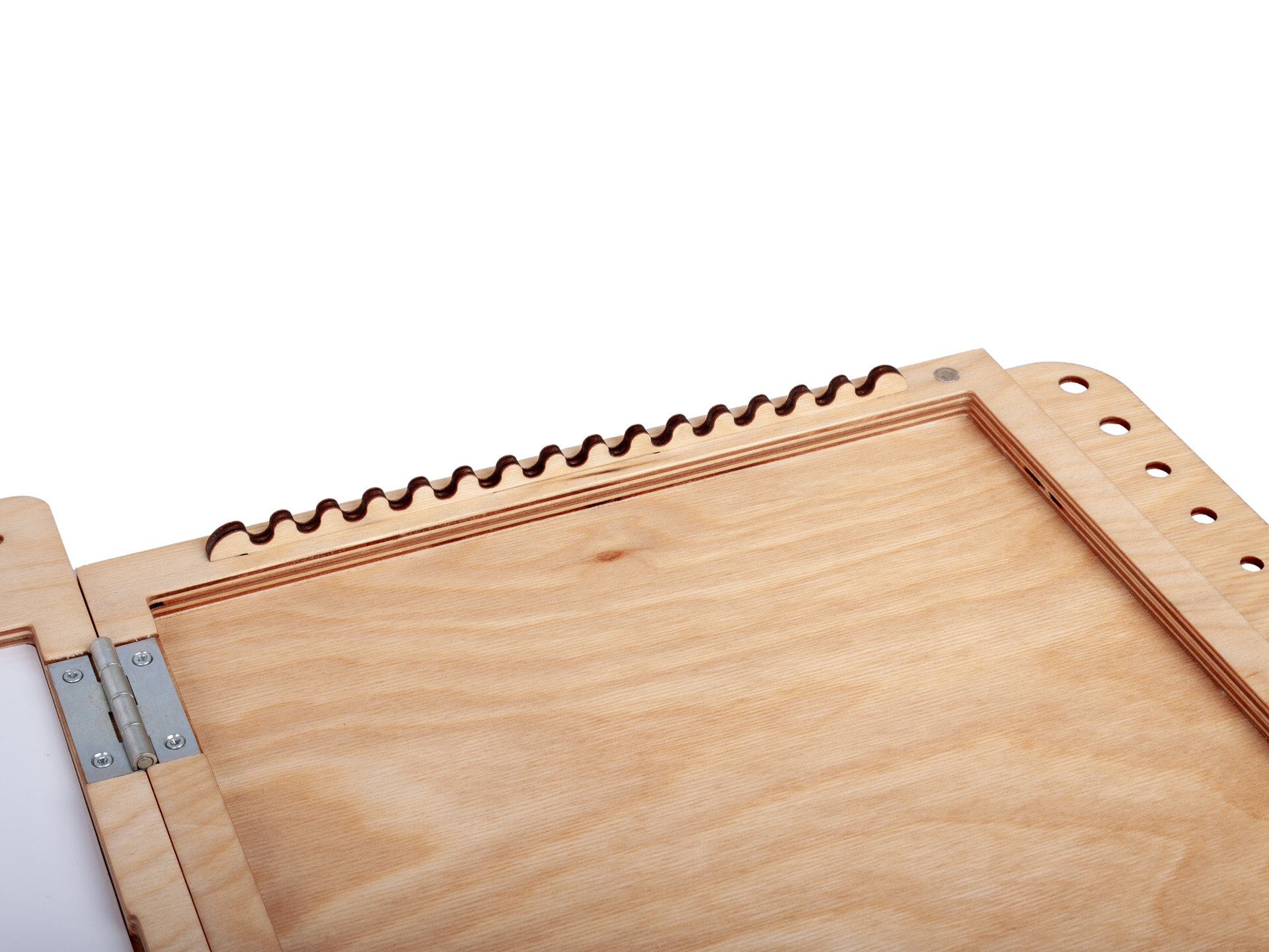 Палитра 60х33 наибольшая среди всех наших палитр. Разработана специально для домашнего или студийного использования. Она достаточно большая, для написания работ любого размера. У вас больше не будет недостатка места для смешивания красок, ведь размер рабочей поверхности 57×25 см. Хотя габариты палитры достаточно велики, благодаря подвижным креплениям вы можете закрепить её на мольберте на любой комфортной для вас высоте. Минимальный просвет между креплениями 280 мм, а максимальный 550 мм. Крепления надёжно фиксируются с помощью двух винтов с гайками «барашками». Дверцы палитры имеют 2 магнитных замка, они плотно закрываются, что позволяет долгое время хранить краски свежими и готовыми к работе. Древесина палитры обработана льняным маслом, обеспечивающим долголетие, износостойкость и влагостойкость. Если данная модель кажется вам слишком большой, или вы хотите брать такую палитру на пленэры, обратите внимание на Среднюю и Малую версии палитры такой конструкции.