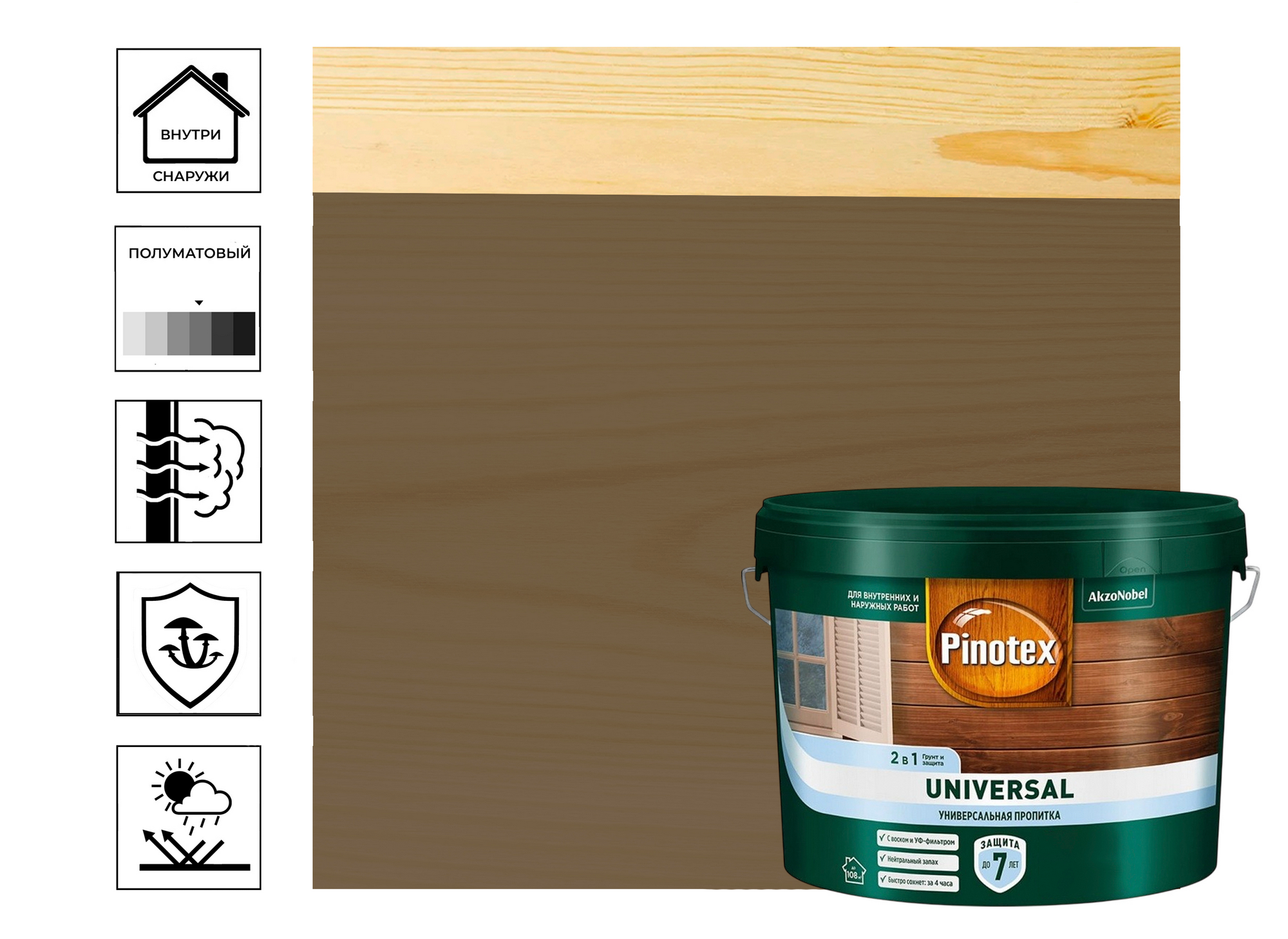 Пропитка для дерева Pinotex Universal используется как для наружных работ, так и безопасна для применения внутри помещений (универсальная), т. к. не содержит биоцидных добавок, не выделяет вредных веществ. Формула 2 в 1: наносится без грунта, питает и защищает от влаги и загрязнений, окрашенная поверхность устойчива к воздействию солнца, дождя, снега и мороза. Pinotex Universal легко наносится и быстро впитывается в поверхность древесины, образуя полуматовое покрытие. Подчеркивает естественную текстуру древесины.