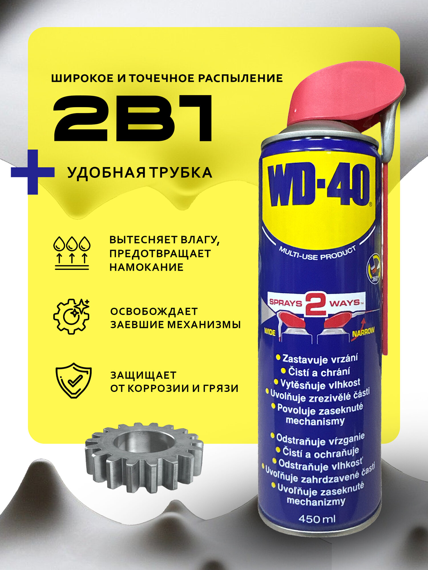 Универсальная смазка WD-40 объемом 450 мл - это незаменимый помощник для автомобилистов, механиков и домашних мастеров. Она обеспечивает надежную защиту от коррозии, смазывает и очищает различные механизмы, предотвращает заедание и замерзание. Смазка обладает высокой проникающей способностью, благодаря чему легко проникает в самые труднодоступные места. Благодаря своему уникальному составу, смазка не оставляет жирных или липких следов и быстро высыхает. Универсальный спрей WD-40 подходит для использования на металлических, пластиковых, керамических и других поверхностях. Он безопасен для большинства материалов и не повреждает лакокрасочное покрытие автомобиля. Спрей поставляется в удобном баллоне с распылителем, что обеспечивает простоту и удобство использования.