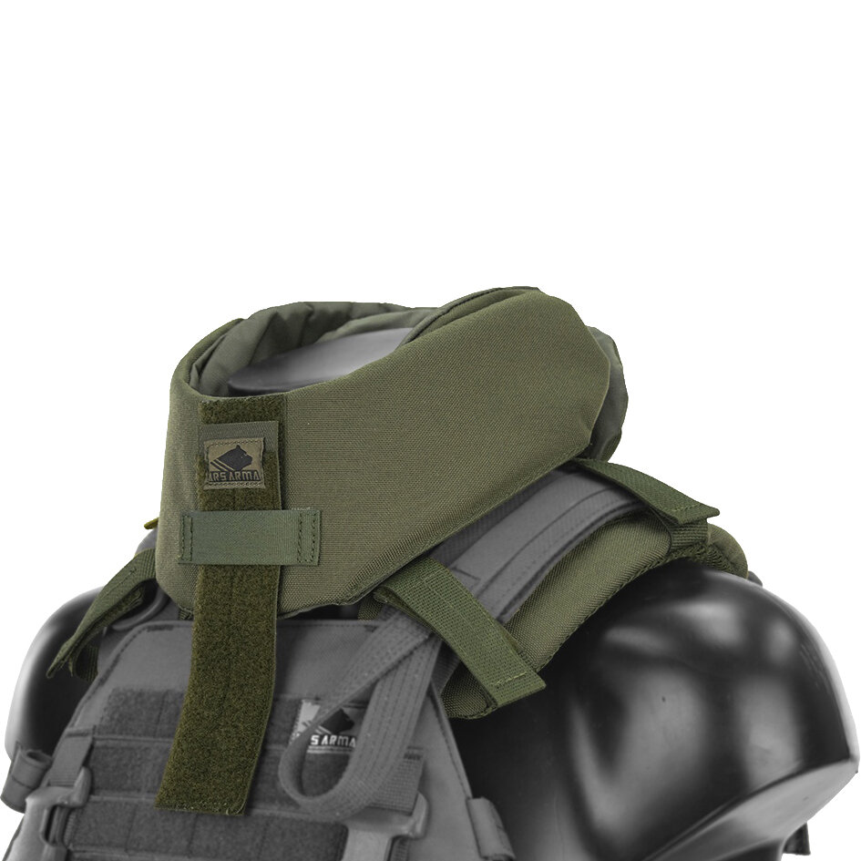 Модуль защиты области шейно-воротниковой части (без баллистики). Внешняя часть изготовлена из кордуры. Часть, обращенная к телу, выполнена из 3D сетки эирмеш для отвода влаги и лучшей вентиляции. Модуль настраивается по объему и положению относительно жилета. Быстро закрепляется и совместим с большинством современных моделей жилетов. Хорошо защищает от шаров и осколков в военно-спортивных играх. Элементы модуля соединяются между собой текстильными липучками. Не содержит элементов баллистической защиты.