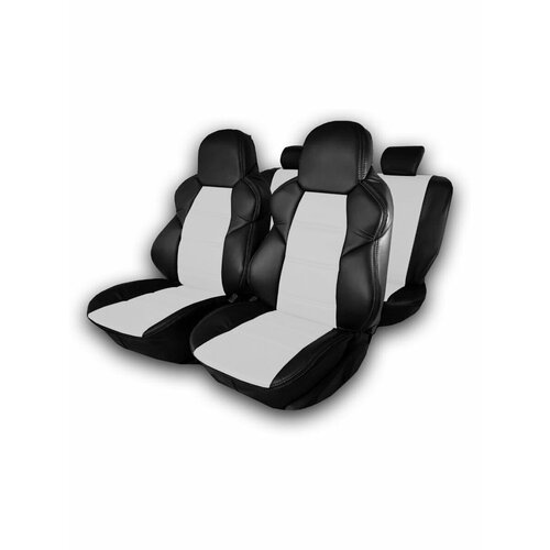 Купить Универсальные авточехлы из экокожи с боковыми поддержками / автомобильные чехлы из экокожи черные с белым с доставкой по всей России.