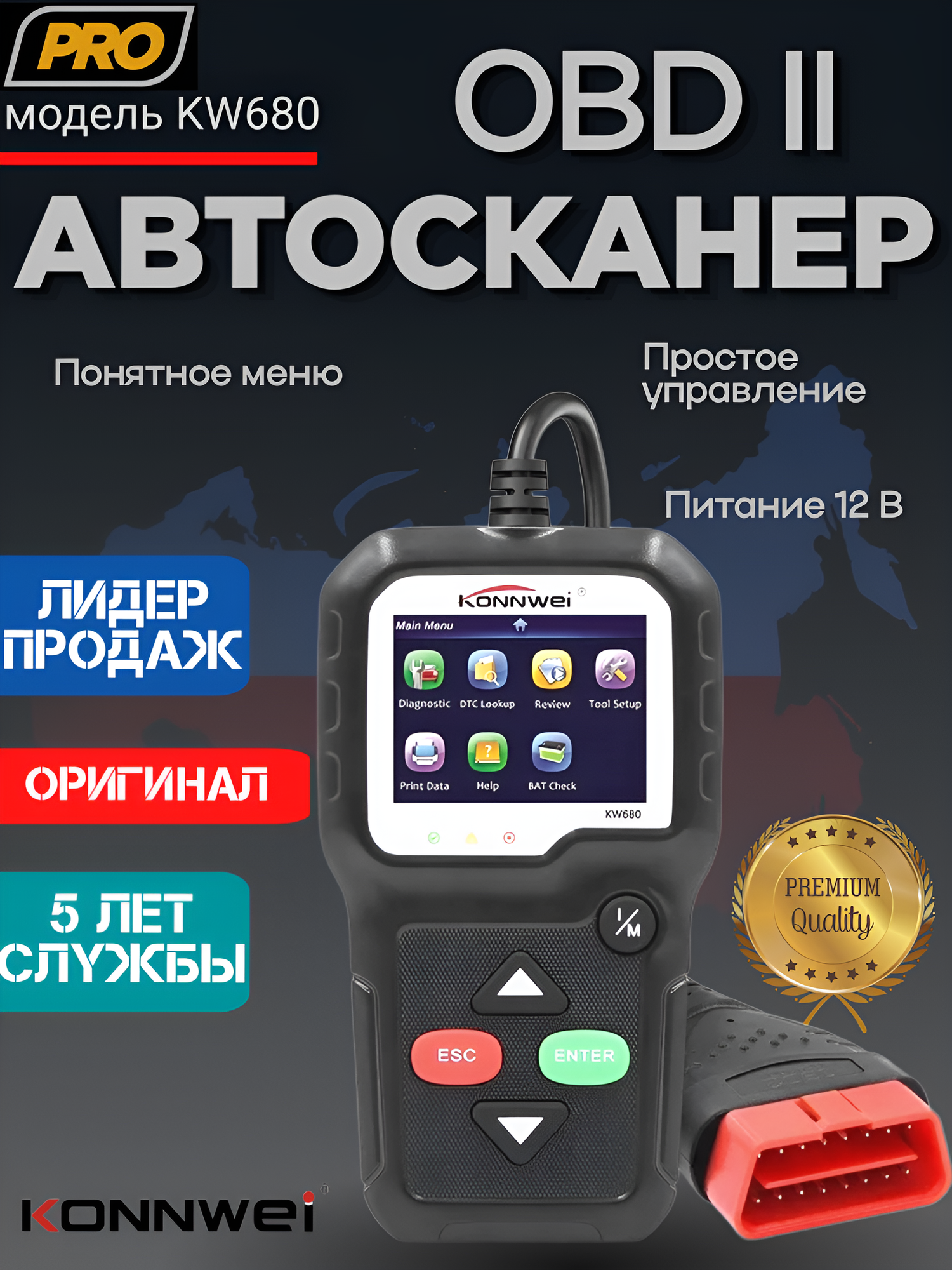 Купить Автосканер KONNWEI KW680 • OBD2 диагностический сканер • Чтение и сброс ошибок, Live Data, диагностика двигателя 12V с доставкой по всей России.