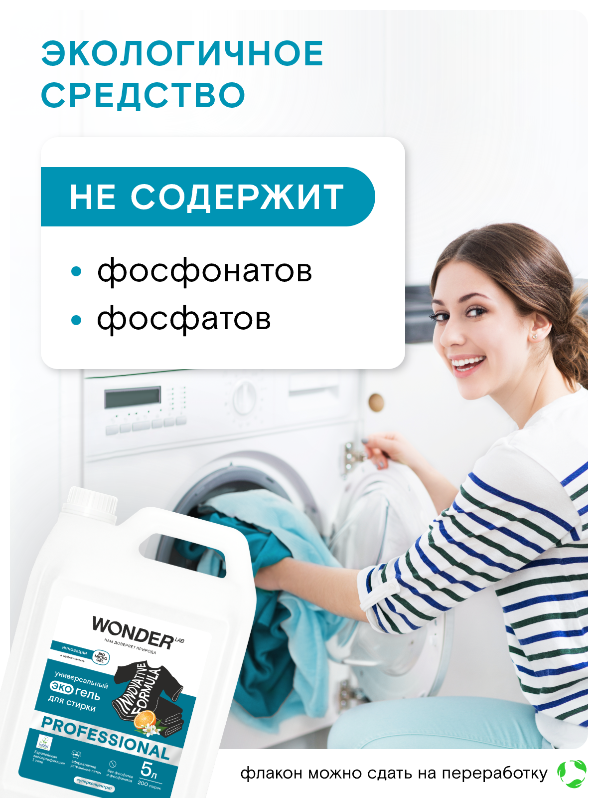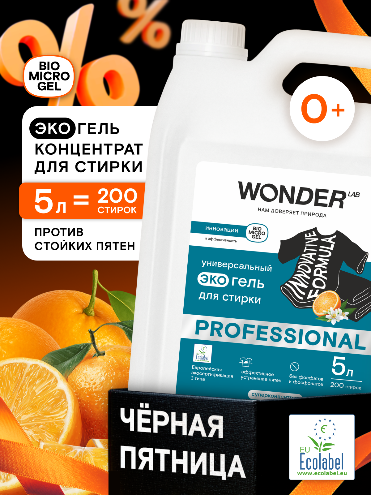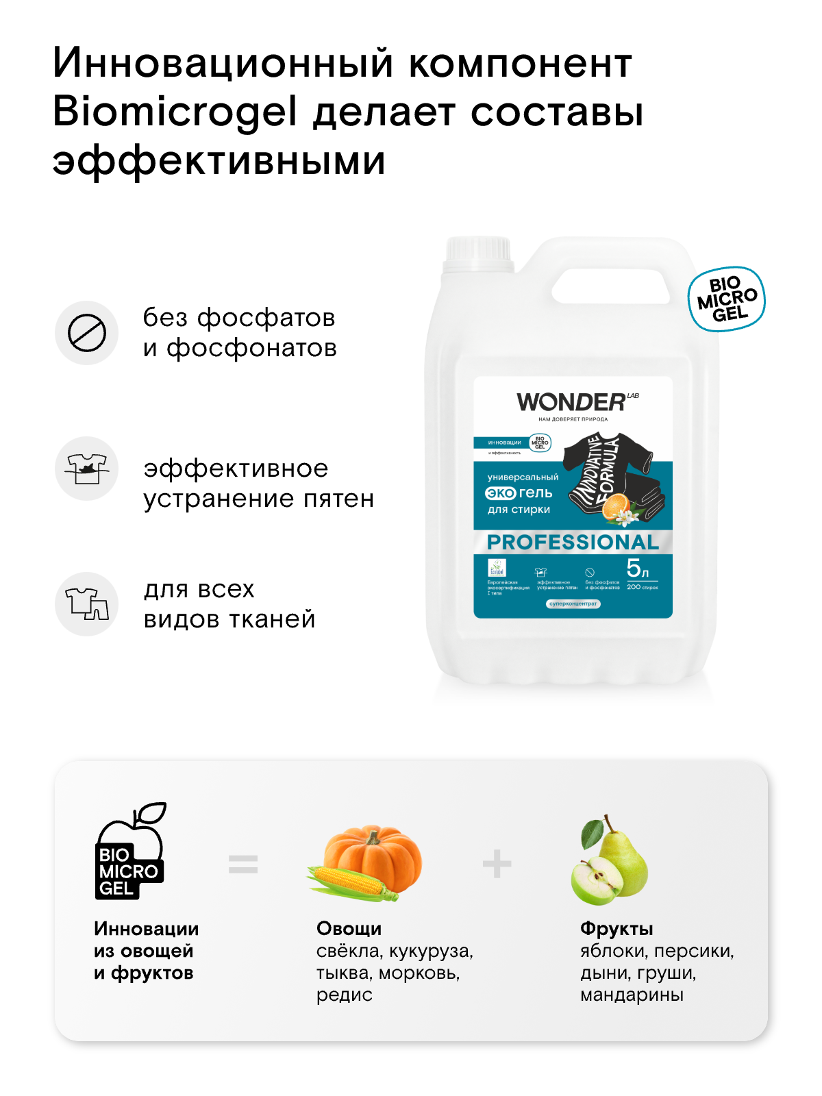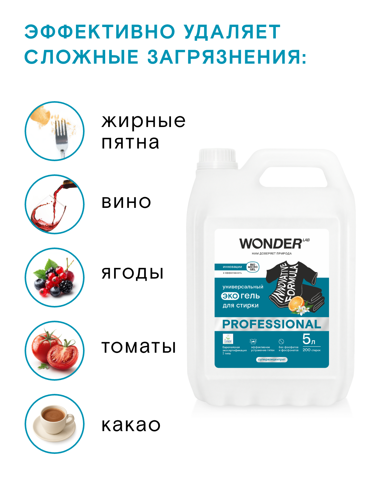 Универсальный гель для стирки Professional, суперконцентрат, против стойких пятен, WONDER LAB, 200 стирок, 5 л: сравнение цен, характеристики, фото, актуальное наличие и цены.