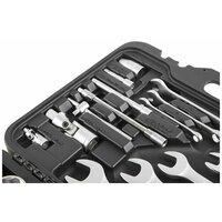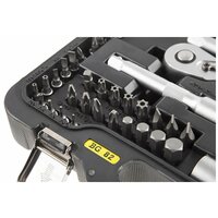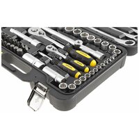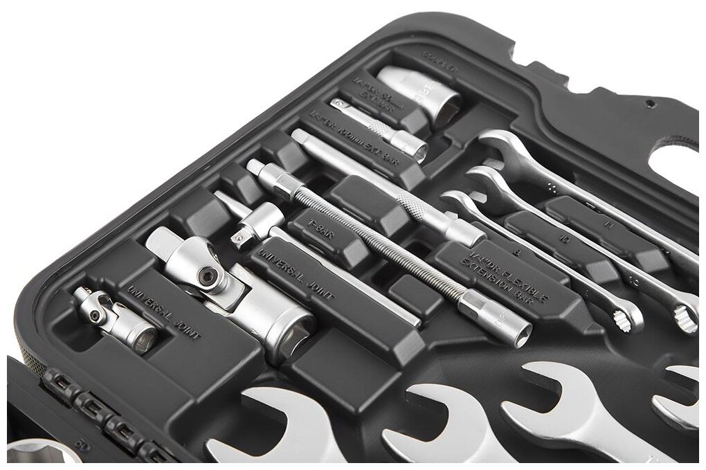в комплекте: 1/4": трещотка (ключ трещоточный с быстрым сбросом) 45 зубов: 150 мм, вороток Т-образный: 110 мм, кардан шарнирный, удлинитель: 50, 100 мм, удлинитель гибкий: 150 мм, отвертка с присоединительным квадратом: 150 мм, бита переходник для электроинструмента; 1/2":трещотка (ключ трещоточный с быстрым сбросом) 45 зубов: 260 мм, удлинитель: 125, 250 мм, кардан шарнирный, переходник скользящий для удлинителей; тип стали инструмента: CR-V (хром-ванадий); материал ручек инструмента: резинопластик; тип стали бит: S2