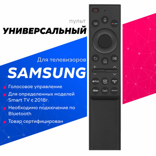 Универсальный голосовой телевизионный пульт дистанционного управления для Smart TV (Смарт ТВ) телевизоров Samsung / Самсунг выпущенных с 2018 года и поддерживающих голосовые пульты (голосовой пульт должен был идти в комплекте с ТВ). Обратите внимание! Для корректной работы голосового поиска необходимо произвести сопряжение пульта с телевизором по инструкции представленной на дополнительном фото товара и в комплекте с пультом. Кнопки онлайн сервисов Netflix, PrimeVideo, Rakuten, OKKO, IVI, MeGogo не будут работать, если на родном пульте такой кнопки не было. Выбирайте этот ПДУ если ваш ТВ Самсунг выпущен начиная с 2018 года и в комплекте у Вас был голосовой пульт, но сломался или потерялся. Наш пульт станет прекрасной заменой, ведь он произведен в соответствии с высокими мировыми стандартами качества и безопасности, что подтверждается соответствующей сертификацией товаров HUAYU.