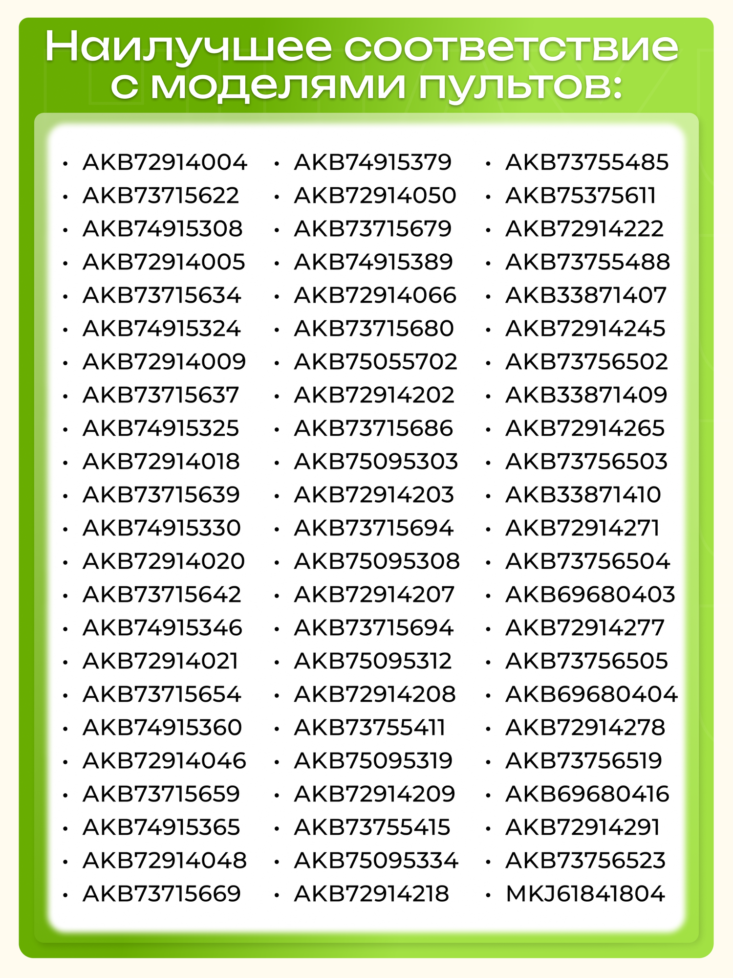Отлично подойдет для замены следующих ПДУ: AKB74455403, AKB73275689, AKB73755415, AKB72914004, AKB72914005, AKB72914020, лджи AKB72914046, AKB72914048, AKB72914202, AKB72914203, AKB72914208, AKB72914209, AKB72914218, AKB72914222, AKB72914235, AKB72914245, AKB72914271, AKB72914274, AKB72914277, AKB72914291, AKB72914293, AKB73275605, AKB73275606 AKB73275612 AKB73275613 AKB73275656 AKB73275681 AKB73275695 AKB73615302 AKB73615303 AKB73615306 AKB73615307 AKB73615308 AKB73615312 AKB73615362 AKB73615302 лж AKB73615303 AKB73755411 AKB73755415 AKB73755485 AKB73755488 AKB73756502 AKB73756504 AKB73756505 AKB73756559 AKB73756560 AKB73756564 AKB73756565 AKB73756576 AKB73756580 AKB73756571 AKB74115502 AKB74455401 AKB74455403 AKB74915330 AKB73715679 и многие другие.