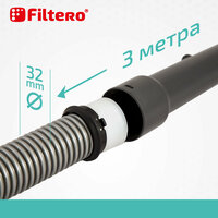 Универсальный гофрированный гибкий шланг длиной 3 метра Filtero FTT 03 для любых типов пылесосов с внутренним диаметром шланга 32 мм. Шланг снабжен специальными кольцами-защелками.