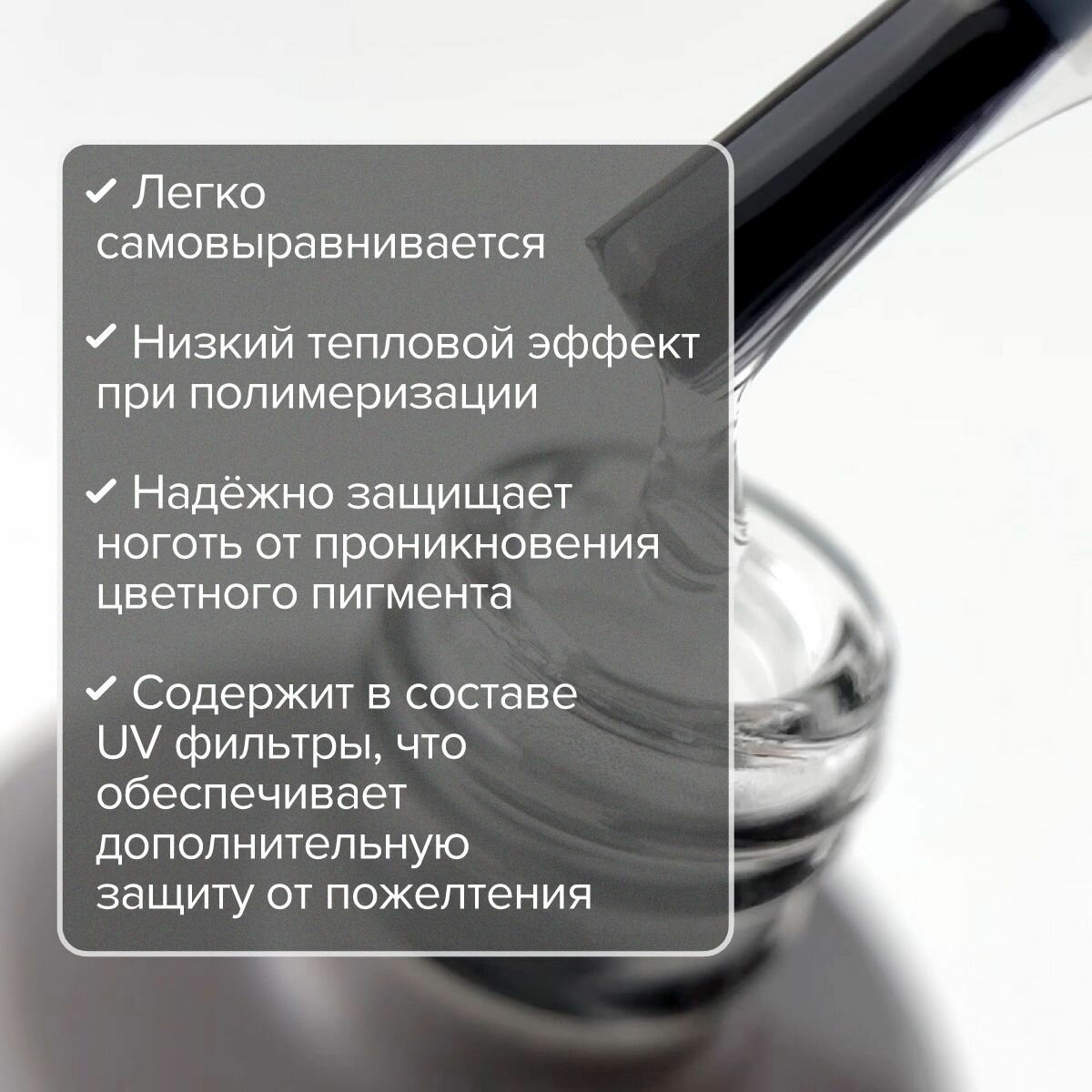 - Надёжно защищает ноготь от проникновения цветного пигмента, обеспечивает хорошее сцепление с цветными гель-лаками.