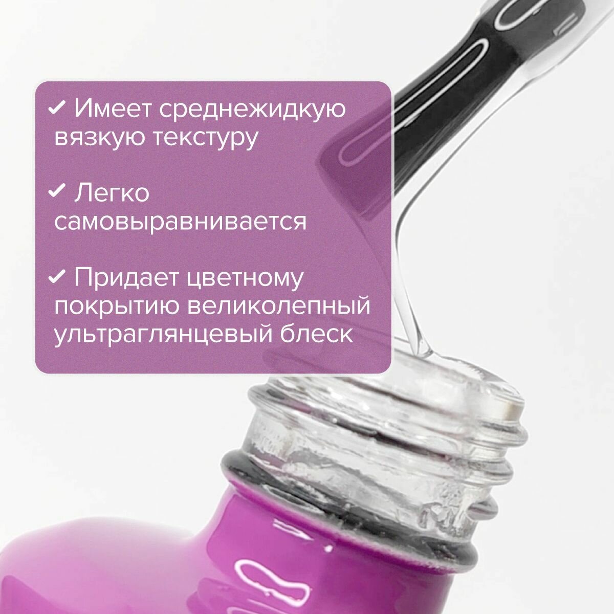Формула данного глянцевого топа для ногтей отличается отсутствием УФ-фильтров, что гарантирует сохранение чистоты оттенков без малейших искажений, желтизны или синевы – особенно важное качество при работе с темными и насыщенными цветами. Топ для ногтей без липкого слоя обладает оптимальной вязкостью, обеспечивающей легкое нанесение и превосходное самовыравнивание без подтеков по боковым валикам.