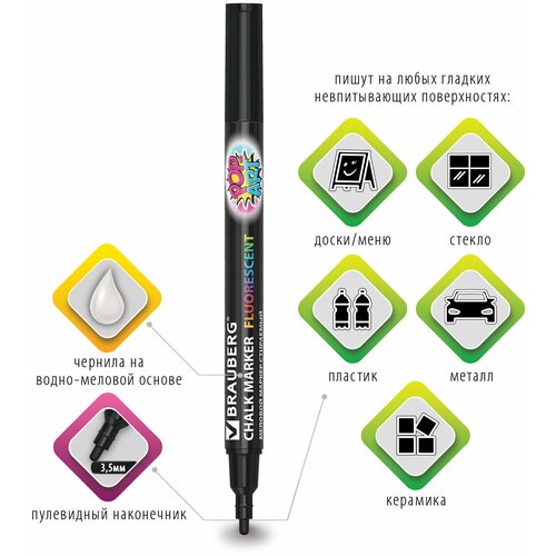 Сухостираемый меловой маркер BRAUBERG "POP-ART" - оригинальный инструмент для оформления различных зон помещений. Идеален для использования на школьных занятиях и детского творчества. Способ применения: 1. Перед использованием хорошо встряхнуть с закрытым колпачком. 2. Снять колпачок, надавить на наконечник, дождаться, когда чернила полностью пропитают его. 3. После использования плотно закрыть колпачок.