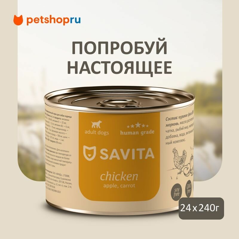 SAVITA консервы для собак «Курица с яблоком и морковью». Влажный корм, 24 шт по 240 г: сравнение цен, характеристики, фото, актуальное наличие и цены.