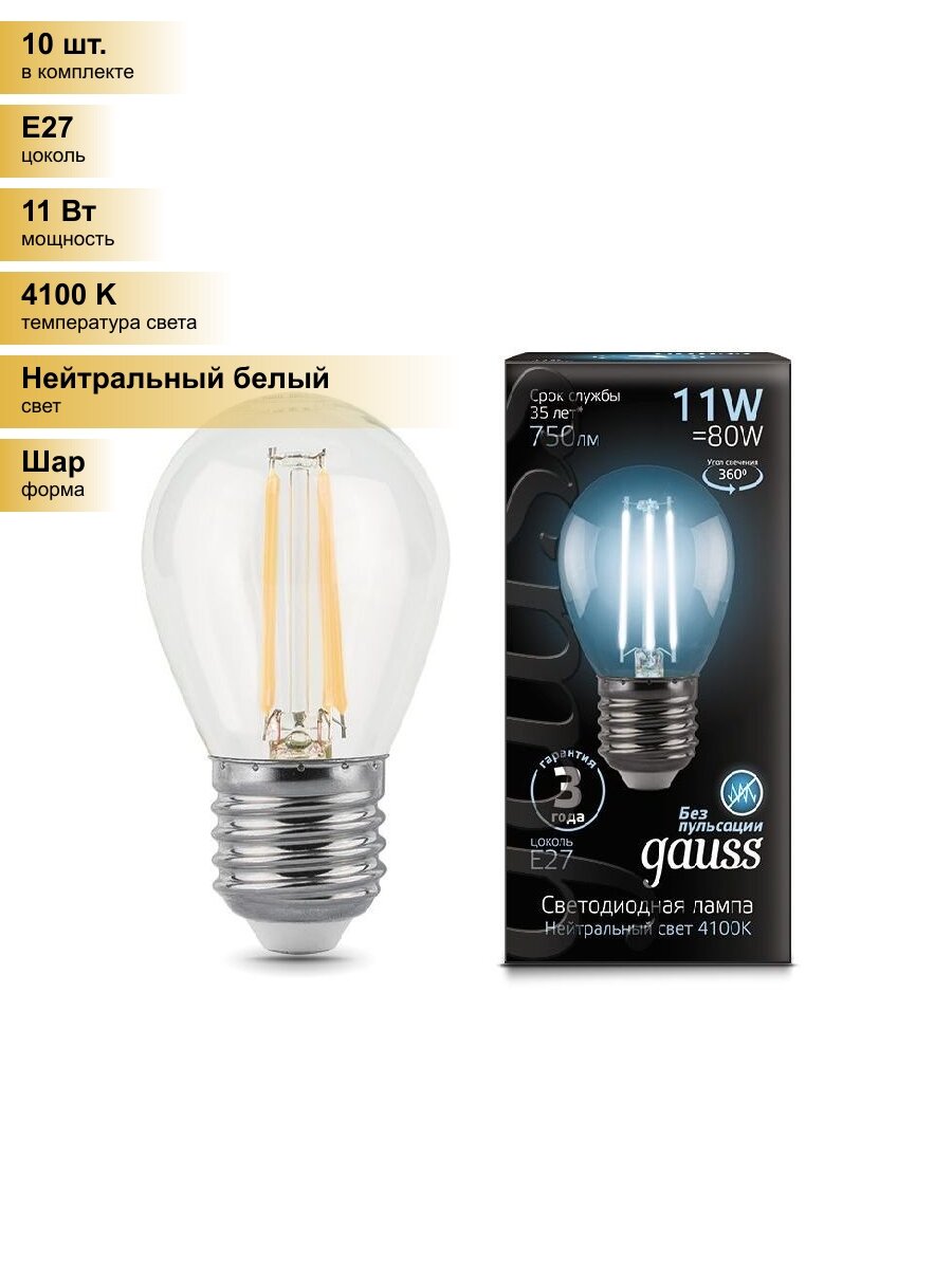 (10 шт.) Светодиодная лампочка Gauss Filament Шар G45 E27 11W 750lm 4100K 4K прозр. филамент (нитевидная) 105802211 Нейтральный белый. Цоколь E27: сравнение цен, характеристики, фото, актуальное наличие и цены.