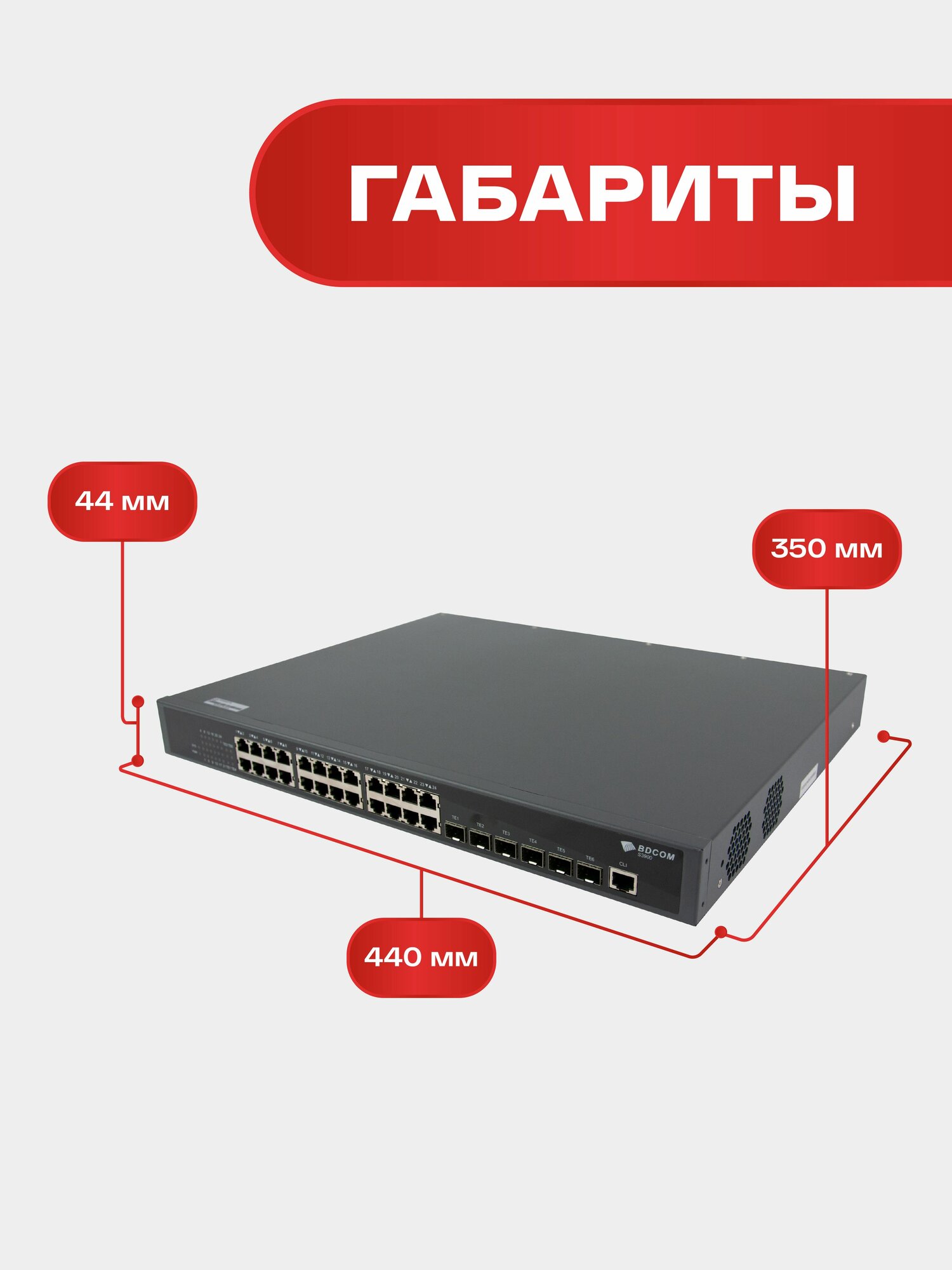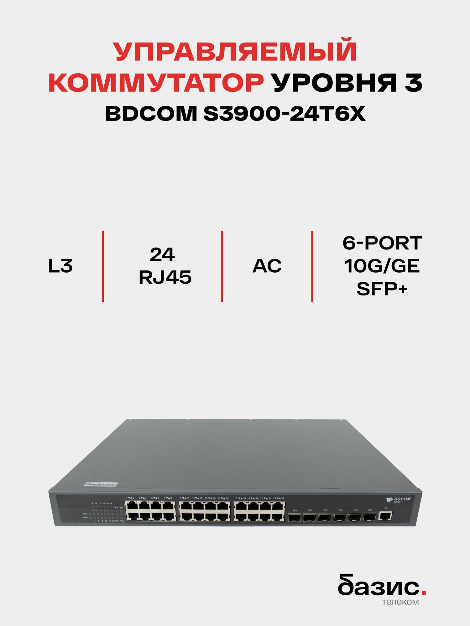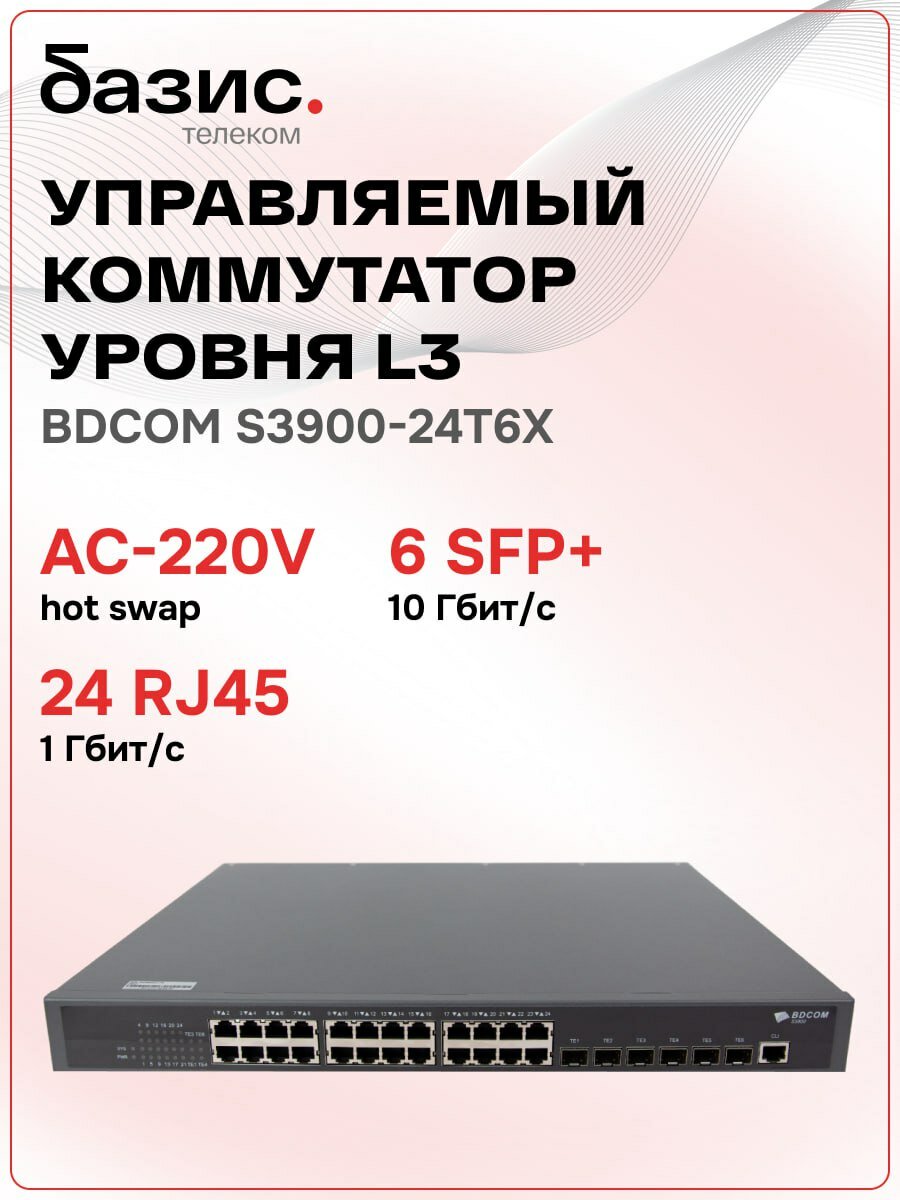 Купить Управляемый коммутатор уровня 3 BDCOM S3900-24T6X, 24×10/100/1000Base-T, 24×100/1000Base-X SFP, 6×1/10GE SFP+, Hot Swap БП 1+1, в комплекте 1x PSU AC с доставкой по всей России.