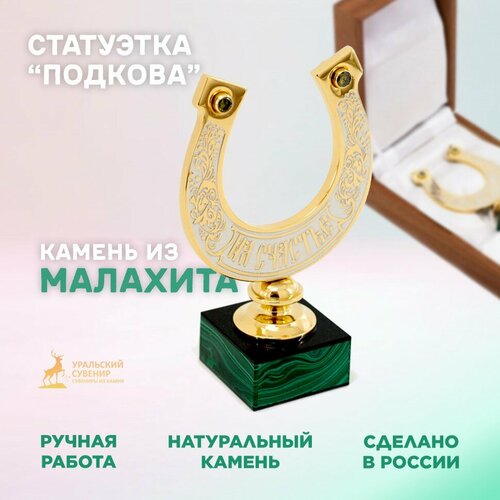 Страна производства: Россия. Высота с постаментом: 12 см Ширина подковы: 7 см Размер постамента: 4 х 4 х 2 см Материал: малахит, долерит, фианиты, латунь Покрытие драг. металлами: никель, золото (999,9 - 5 мкм) Техника исполнения: художественное литье, рисовка кистью, травление, гравирование, никелирование, золочение, работы по камню Размер упаковки: 18 х 13 х 6 см Упаковка: подарочный деревянный ящик с бархатным ложементом Вес: 750 граммов