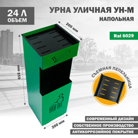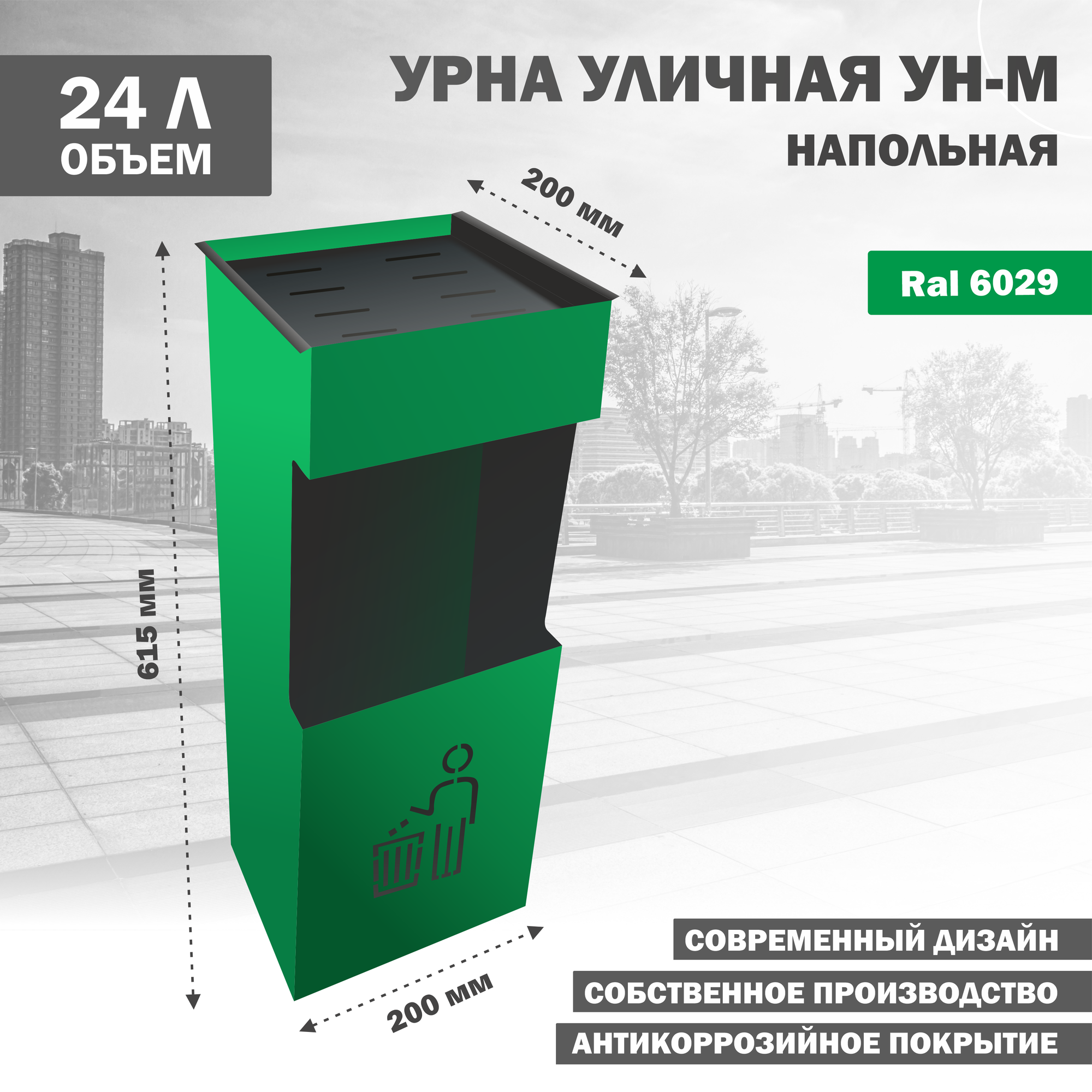 Модель УН-М выполнена в ярком зеленом цвете, что делает ее заметной и привлекательной. Урна предназначена для напольной установки без крепления, что обеспечивает простоту и удобство использования.