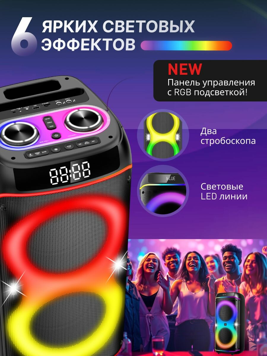влагозащищенный корпус, встроенный микрофон (функция HandsFree), караоке, поддержка microSD, ремешок, ручка, световые эффекты