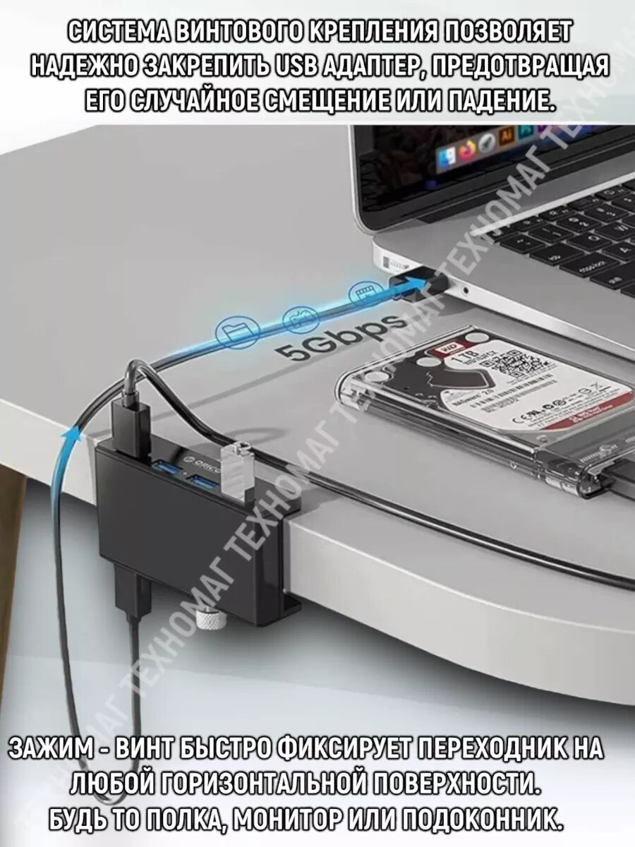Usb hub 3.0 с креплением – это надежное и удобное устройство, которое поможет расширить количество юсб портов на компьютере или игровой приставке. С этим разветвителем вы сможете подключать одновременно различные устройства и накопители. Переходник не требует установки специальных драйверов и поддерживает работу с основными операционными системами. Хаб с type-c оснащен четырьмя высокоскоростными портами, которые обеспечивают быструю передачу данных. Его стильный корпус выполнен из прочного и легкого алюминиевого сплава. Система винтового крепления позволяет надежно закрепить юсб адаптер, предотвращая его случайное смещение или падение. Зажим - винт быстро фиксирует переходник на любой горизонтальной поверхности. Будь то полка, монитор или подоконник. Это идеальное решение для домашнего и офисного использования. Мощный разветвитель поддерживает высокую скорость синхронизации. 4-портовый концентратор идеален для тех, кто хочет иметь всегда под рукой достаточное количество разъемов. Инновационный и универсальный USB хаб упростит выполнение рабочих задач, обеспечивая стабильное соединение и оперативную передачу данных с различных накопителей.