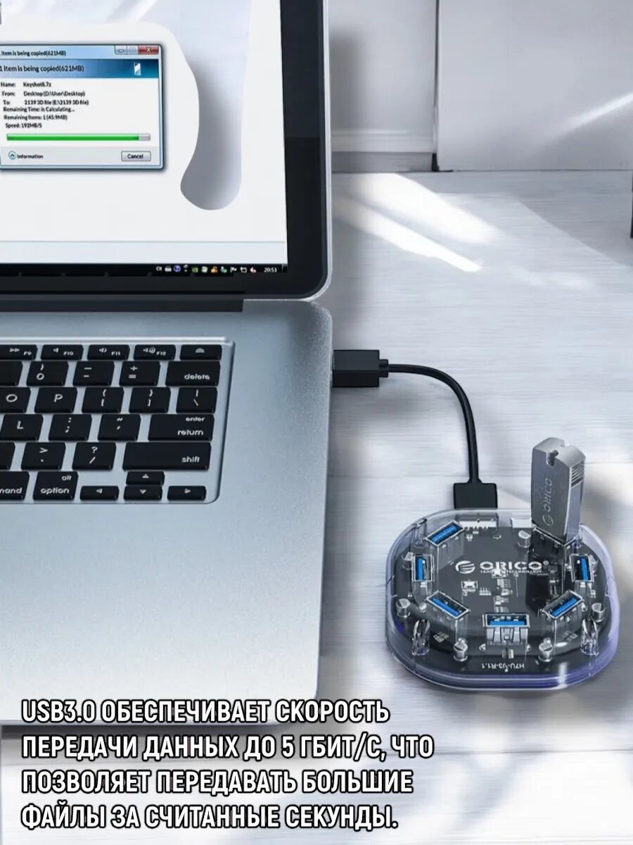 ORICO-H7U-U3-CR-BP - прозрачный 7-портовый концентратор USB 3.0. Модель имеет два разъема питания. Эти два независимых порта источника питания обеспечивают более стабильное подключение и передачу данных для мощных устройств подключаемых к хабу. Один порт - это порт основного источника питания, второй - резервный порт. Важно! В комплект хаба не входит зарядное устройство или кабель питания. В комплекте стандартный кабель длиной 1м. Кабель USB-A на USB MICRO-В позволяет подключать обычные зарядные устройства для мобильных телефонов Размеры: 75*75*19мм