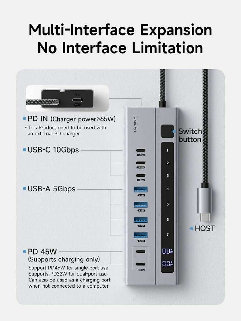 Hagibis Multi-C Port Expansion Dock, Type-C Hub, USB Splitter, HUB Converter, PD Fast Charging, Independent Power Supply with Switch, Adapter Suitable for Apple Computers And Mac Laptops: сравнение цен, характеристики, фото, актуальное наличие и цены.